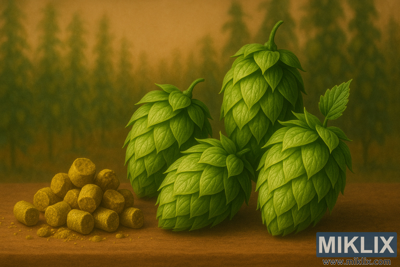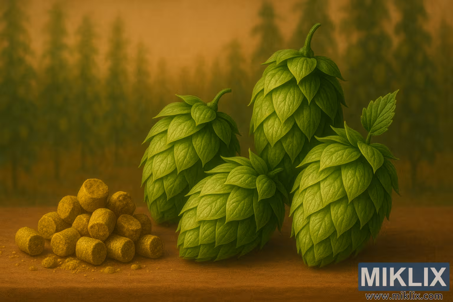 Bakgrunden, mjukt suddig, avbildar ett stiliserat humlefält som sträcker sig i fjärran, rader av höga humlelådor som klättrar mot himlen och försvinner i ett jordigt dis. Denna pastorala bakgrund placerar stillebenet i dess naturliga ursprung och förankrar kottarna och pelletsen i odlingens bredare sammanhang. Effekten är både romantisk och informativ och påminner betraktaren om att humlens resa inte börjar i bryggeriet utan i jorden, under vård av odlare som lockar dessa växter att blomstra säsong efter säsong. De varma, gyllenbruna tonerna som genomsyrar hela bilden ger en jordig kvalitet som frammanar humleodlingsregionernas terroir och den djupa kopplingen mellan mark och bryggtradition.