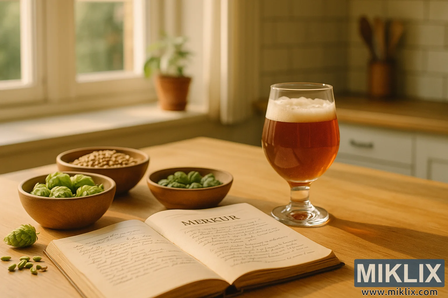 En fridfull bryggningsscen utspelar sig på en solig köksbänk, med en öppen Merkur-kokbok med handskrivna anteckningar, färsk humle och korn samt ett glas bärnstensfärgat öl, vilket frammanar hantverk och bryggtradition.