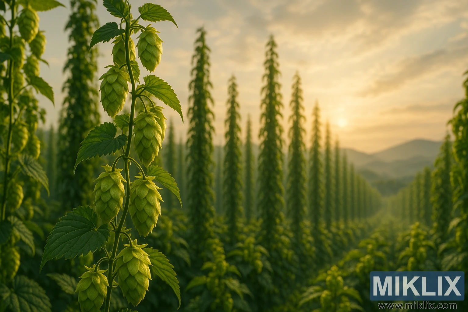 Sammantaget förmedlar bilden den unika karaktären och den jordbruksmässiga skönheten hos humlesorten Shinshuwase, hyllad för sin citrusaktiga och blommiga arom och sin viktiga roll i att tillverka exceptionella öl. Kompositionen fångar inte bara ett fält, utan ett ögonblick upplyst i varmt ljus, vilket betonar harmonin mellan natur, odling och bryggandets konstnärliga skick.