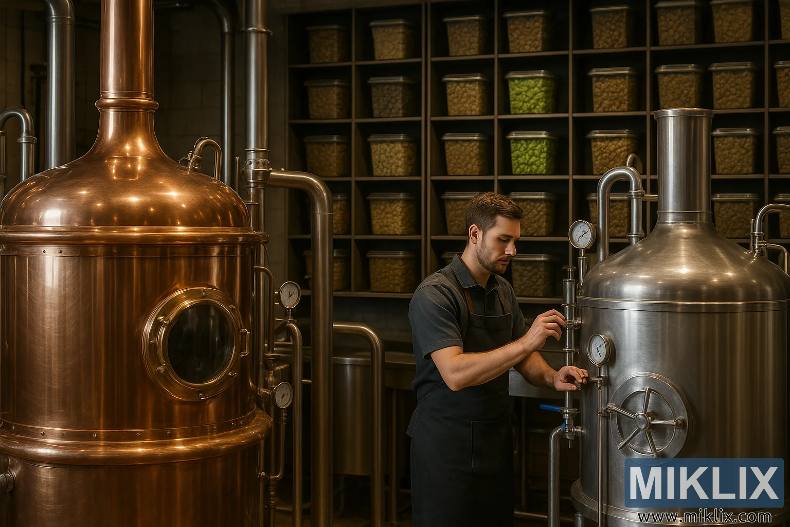 En industriell bryggerinredning med kopparkitlar, jäsningstankar och hyllor med livfull Target-humle, vilket framhäver precisionen i hantverksölsbryggning.