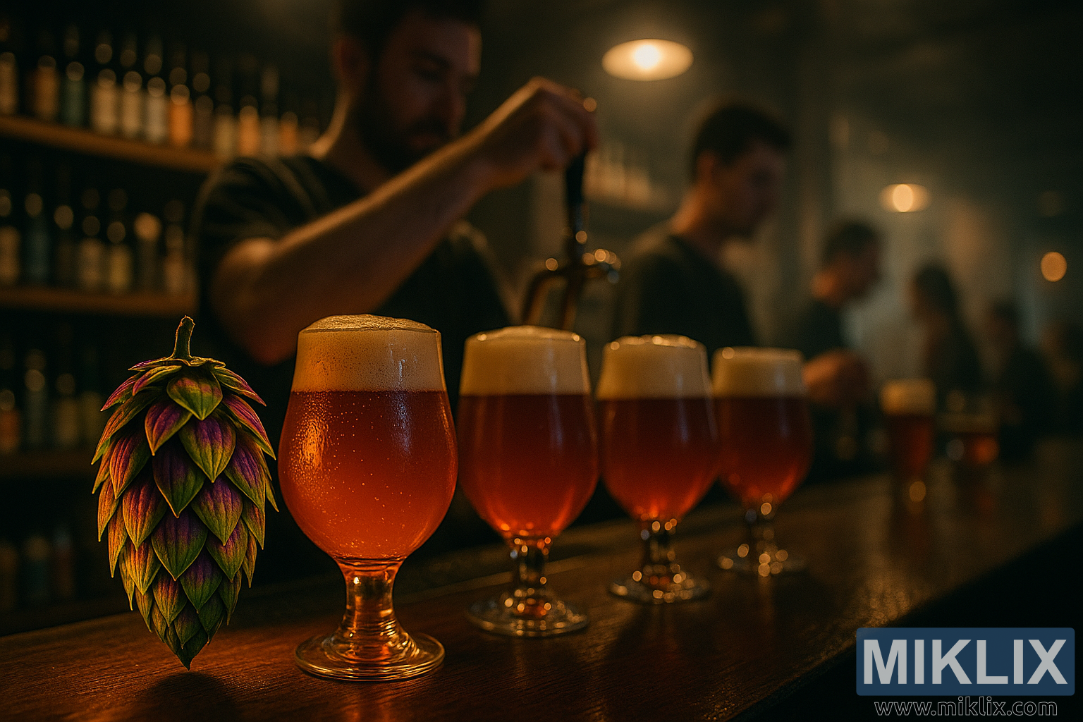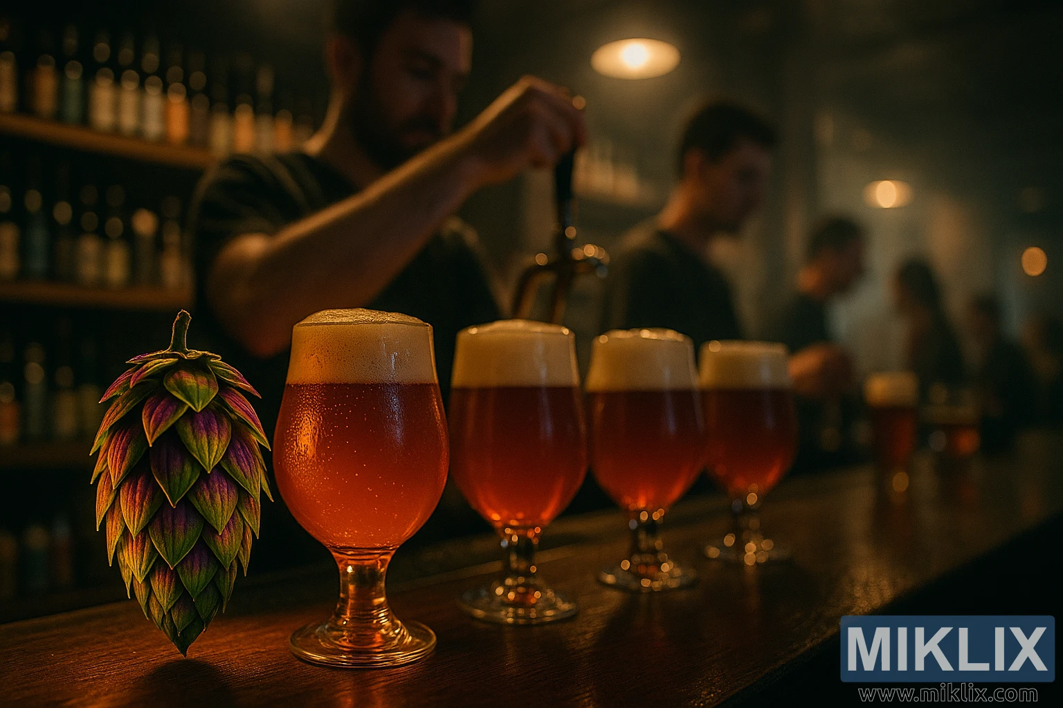 Denna atmosfäriska och varmt upplysta barscen fokuseras fokus på en polerad trädisk klädd med flera tulpanformade glas fyllda med rik bärnstensfärgad hantverksöl. Ölen glöder mjukt under den dämpade belysningen, med skummande, krämiga skumhuvuden som reser sig ovanför kanten på varje glas. Små bubblor klamrar sig fast vid glasets insida, fångar ljuset och ger textur och djup. Till vänster i förgrunden sitter en slående Vic Secret-humlekott, återgiven i livfulla gröna och lila nyanser, framträdande. Dess lager-på-lager-blad verkar nästan skulpturala, och samspelet mellan färger ger den en lysande kvalitet, som om ljuset subtilt filtreras inifrån själva kotten. Dess närvaro introducerar en livfull kontrast till den varma, bärnstensdominerade paletten av öl och trä.