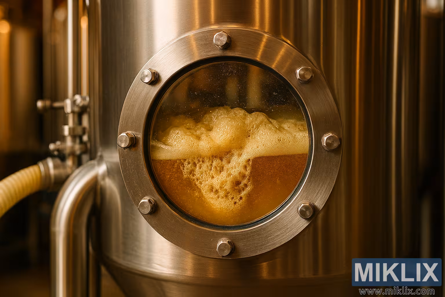 Högupplöst bild av en jästank i rostfritt stål i ett kommersiellt bryggeri, med ett glasfönster med bubblande tysk lageröl under aktiv jäsning.