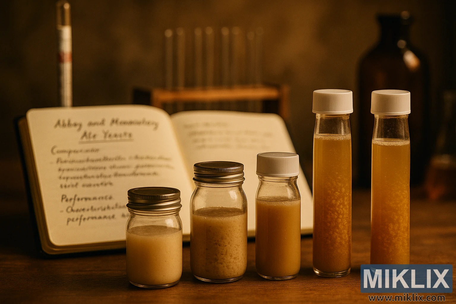 Ett varmt stilleben visar burkar och flaskor med klosteröljäst med en suddig anteckningsbok och laboratorieverktyg, som blandar bryggtradition och vetenskap.