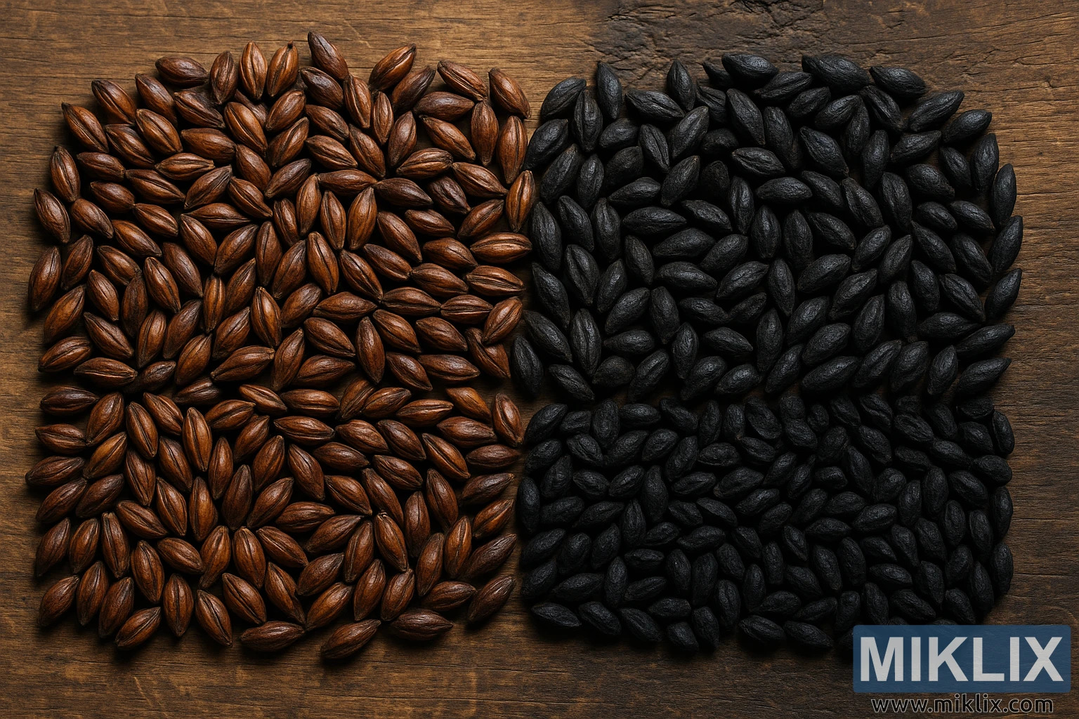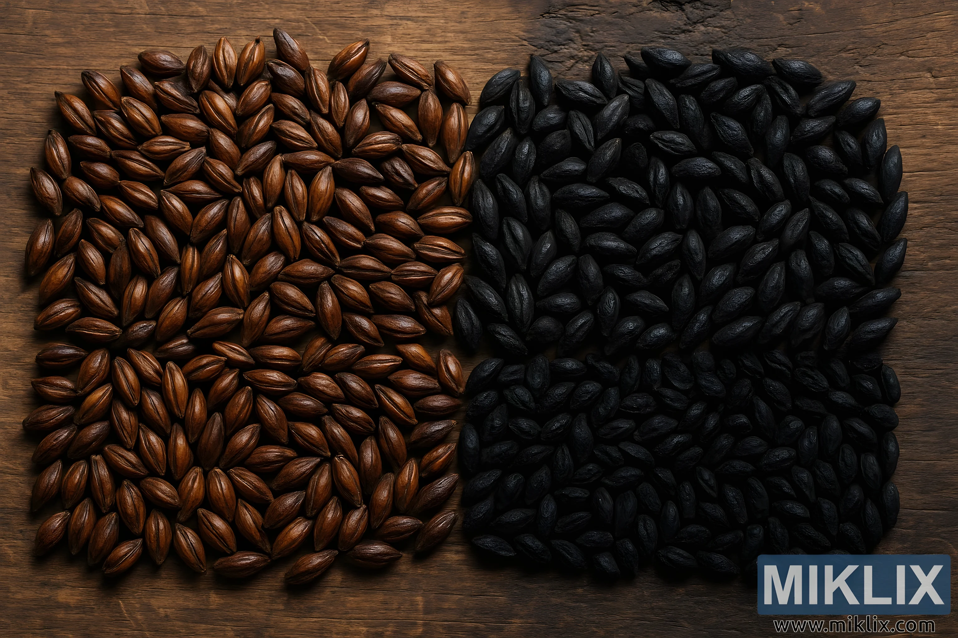 Två typer av mörkrostade malter, choklad och svart, arrangerade på rustikt trä, vilket framhäver rika färger, texturer och rostningsnivåer för bryggning.