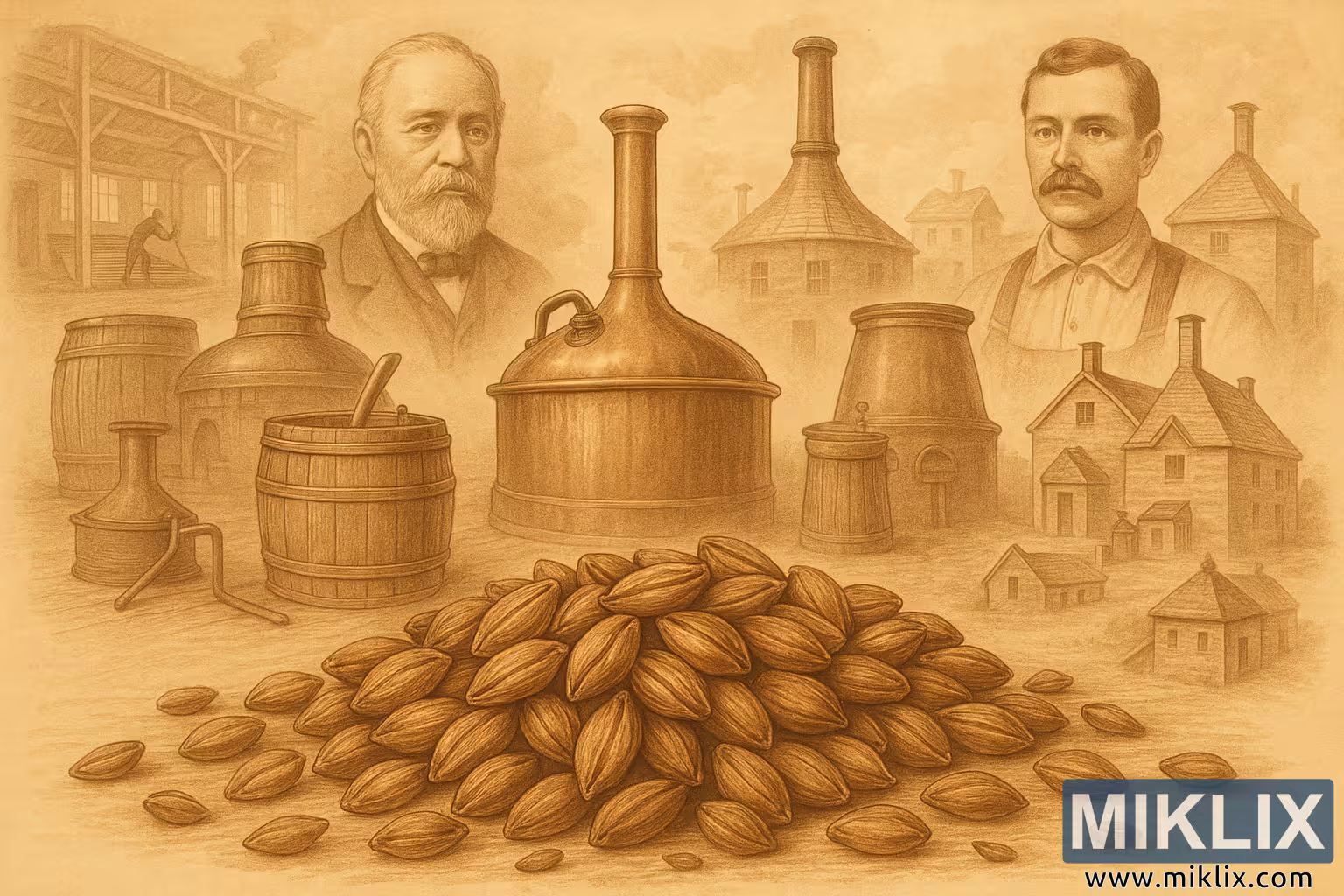 bakgrunden öppnar sig illustrationen i ett disigt montage av gamla fabriksbyggnader och verkstadsinredningar. Deras silhuetter mjukas upp av atmosfäriska skuggningar, vilket skapar en känsla av djup och minne. Arkitekturen är utilitaristisk men ändå charmig, med sneda tak, tegelfasader och höga fönster som antyder det naturliga ljus som en gång användes för att belysa verken inuti. Bland dessa strukturer finns två män, framträdande framträdande och skildrade med vördnad för historiska porträtt. Deras klädsel och hållning antyder att de är viktiga personer – kanske banbrytande mälterier eller grundare av ett traditionsrikt varumärke – som står som symboler för den mänskliga uppfinningsrikedom och det arbete som ligger till grund för hantverket.