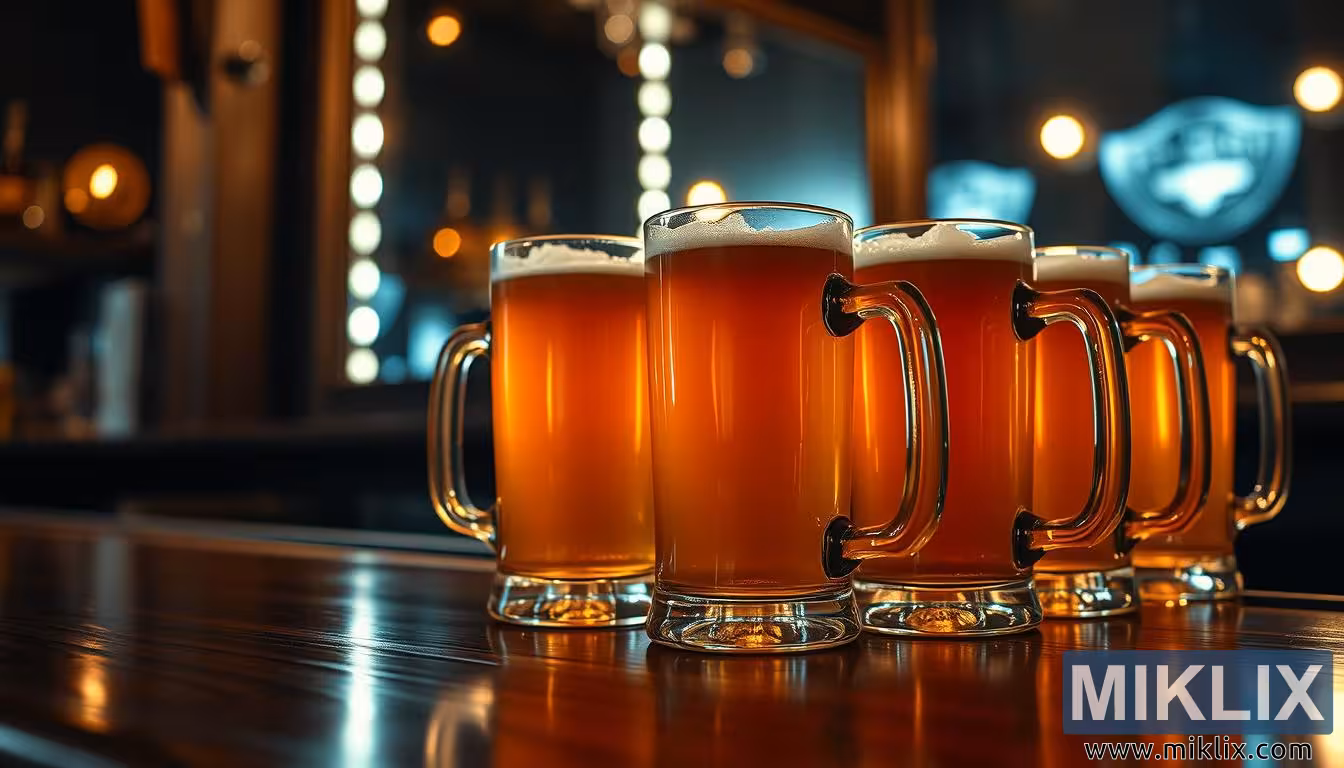 Badande i det mjuka skenet av omgivande ljus fångar bilden ett ögonblick av stillsam njutning och gemensam värme i en svagt upplyst bar. Fokuspunkten är en rad med fem ölmuggar i glas, var och en fylld med en blek bärnstensfärgad vätska som glöder med en subtil inre eld. Ölen, troligen bryggda med blek chokladmalt, skimrar med en rik nyans som övergår från gyllene karamell i toppen till en djupare, rostad bronsfärg nära basen. Deras skummande vita skum sitter tjockt och krämigt, klamrar sig fast vid kanten av varje mugg och antyder en välbalanserad kolsyra och en len, sammetslen munkänsla.