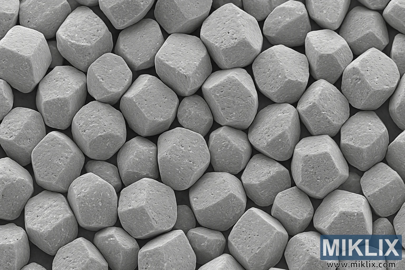 Mot en ren vit bakgrund framträder granulerna i skarp relief, deras gråtoner och invecklade konturer betonas av avsaknaden av visuellt brus. Denna minimalistiska bakgrund förstärker känslan av fokus och kontroll, vilket förstärker bildens vetenskapliga avsikt. Det är inte bara ett fotografi – det är en studie, en ögonblicksbild av molekylär arkitektur som inbjuder till analys och tolkning. Kompositionen är stram och uppslukande, fyller hela bilden med granulerna och skapar en känsla av skala som känns både intim och expansiv.