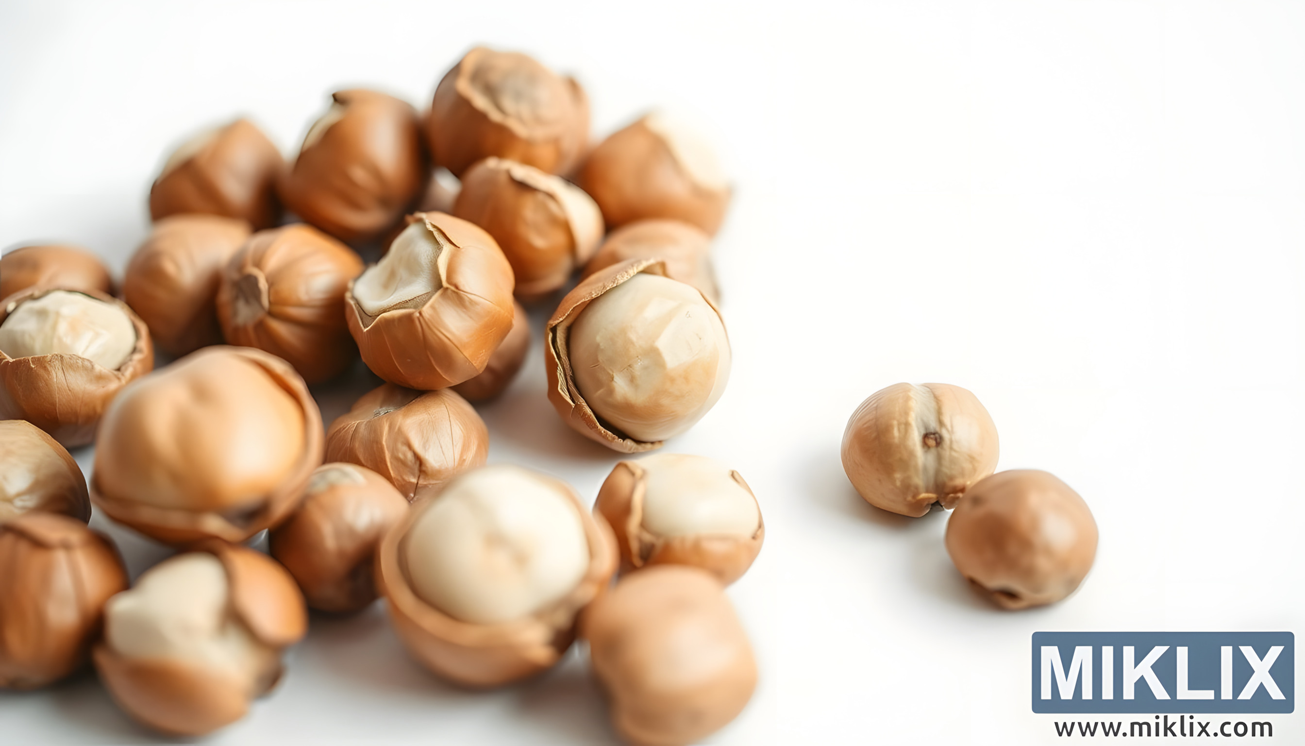 Makrofoto av ekologiska hasselnötter med gyllenbruna skal och nötig insida mot en vit bakgrund, som framhäver deras konsistens, hälsofördelar och naturliga skönhet.