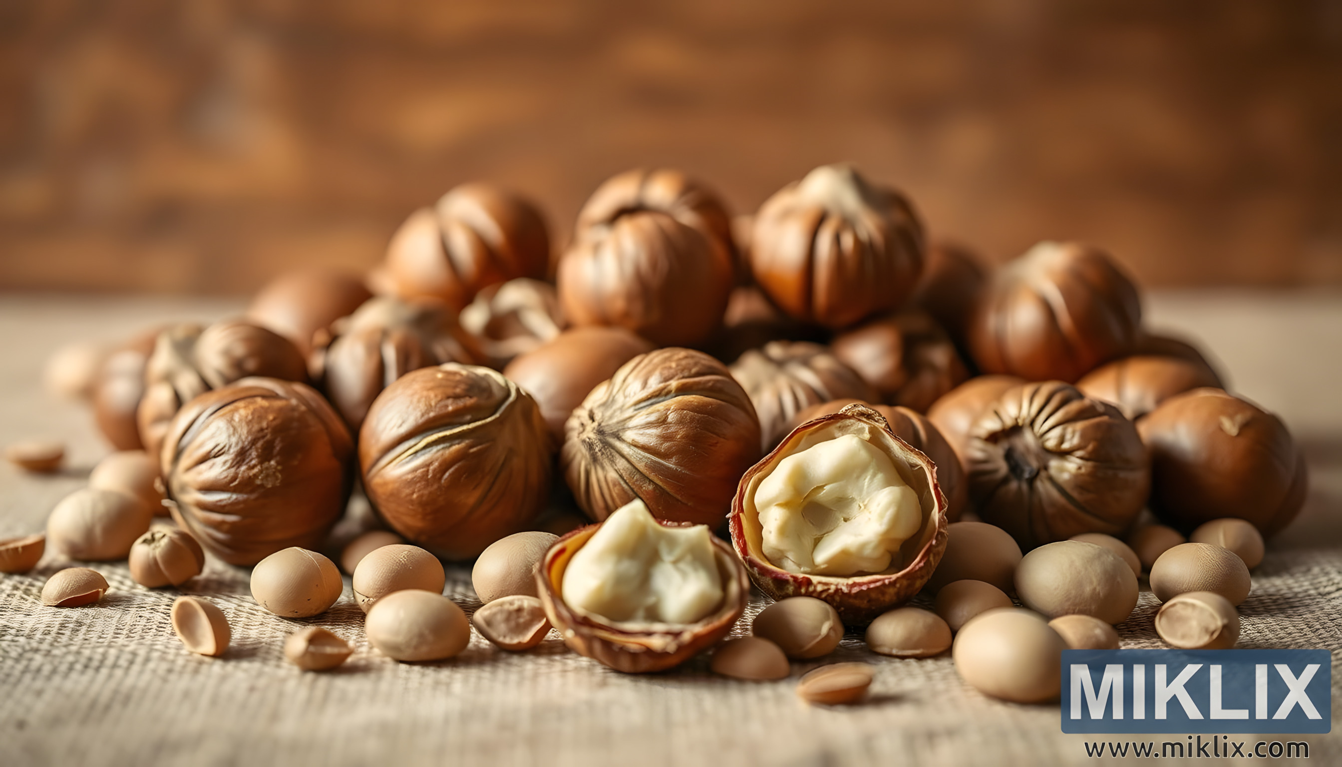 Bakgrunden bidrar till arrangemangets värme och naturliga charm. Hasselnötterna vilar på ett rustikt, neutralt tonat tyg som mjukar upp kompositionen och introducerar en subtil textur. Dess vävda yta harmoniserar med nötternas organiska egenskaper och förankrar dem i ett jordnära sammanhang som känns ärligt och opretentiöst. Bakom den centrala klustret fördjupar en bakgrund av varma, suddiga toner – troligen trä eller ett liknande rustikt material – atmosfären av naturlig enkelhet. Dessa nyanser förstärker känslan av hemtrevlighet och näring, vilket skapar en miljö som känns lika tidlös som nötterna själva. Den övergripande effekten är en av mysighet och jordnära stämning, som påminner om kök, marknader och utrymmen där mat vårdas för både näring och tradition.