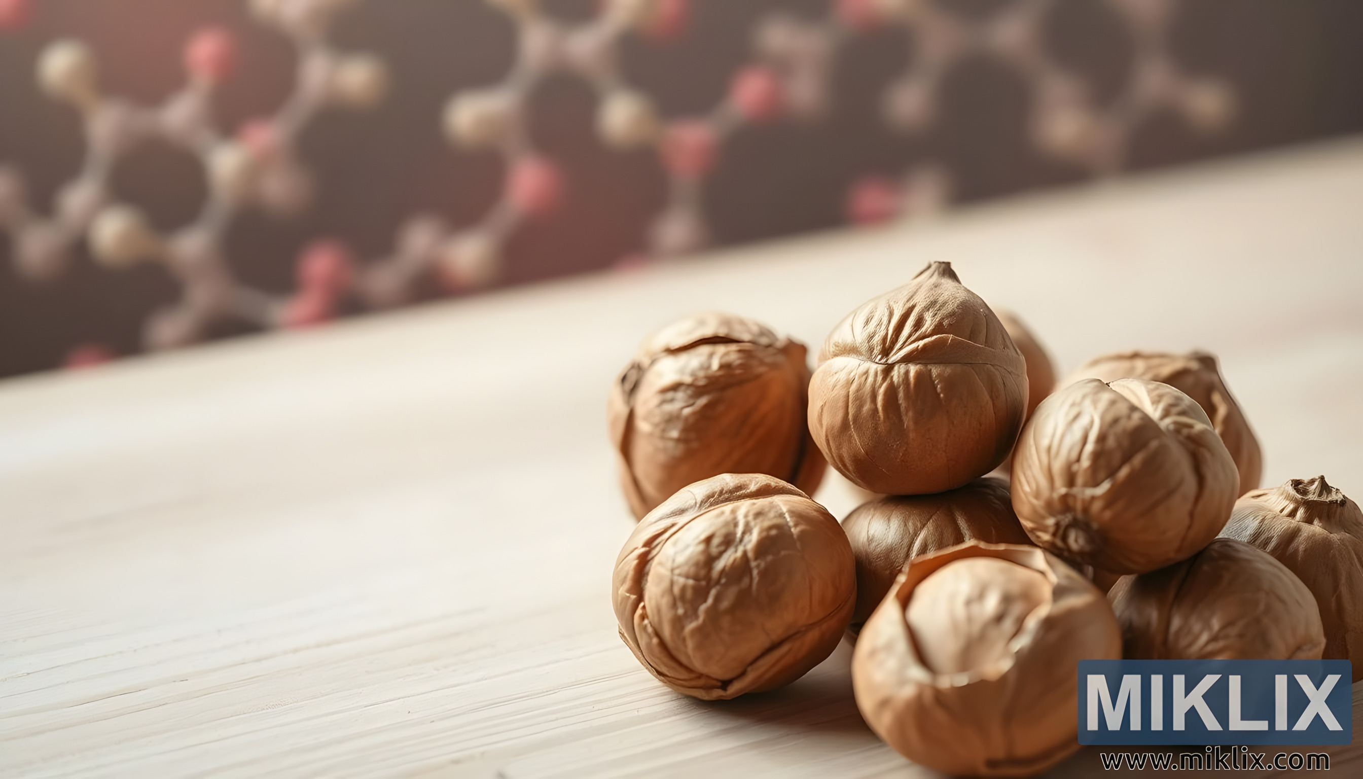 Närbild av skalade hasselnötter på en ljus träyta med suddiga molekylära former i bakgrunden, vilket symboliserar deras naturliga antiinflammatoriska fördelar.
