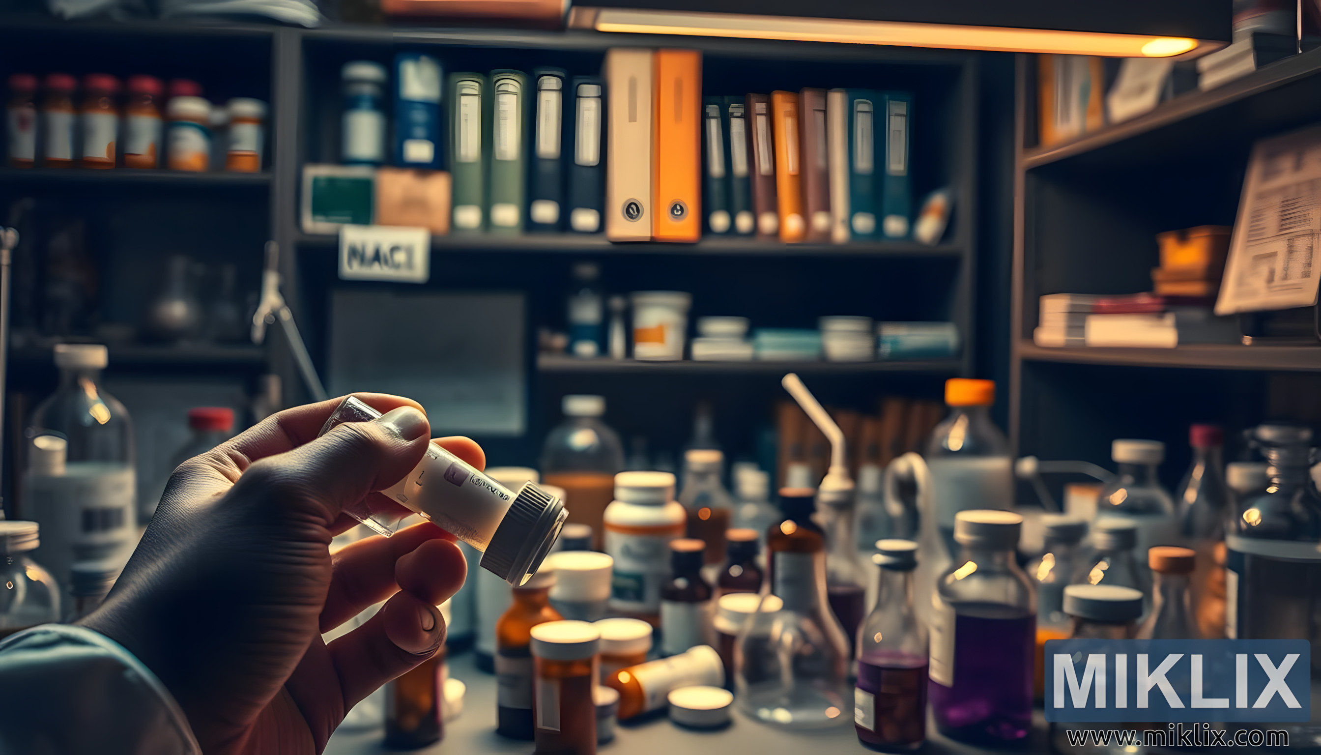 Klinisk laboratoriescen med en hand som mäter NAC-tillskott, omgiven av pillerflaskor och medicinska verktyg, vilket belyser vikten av medvetenhet om läkemedelsinteraktioner.