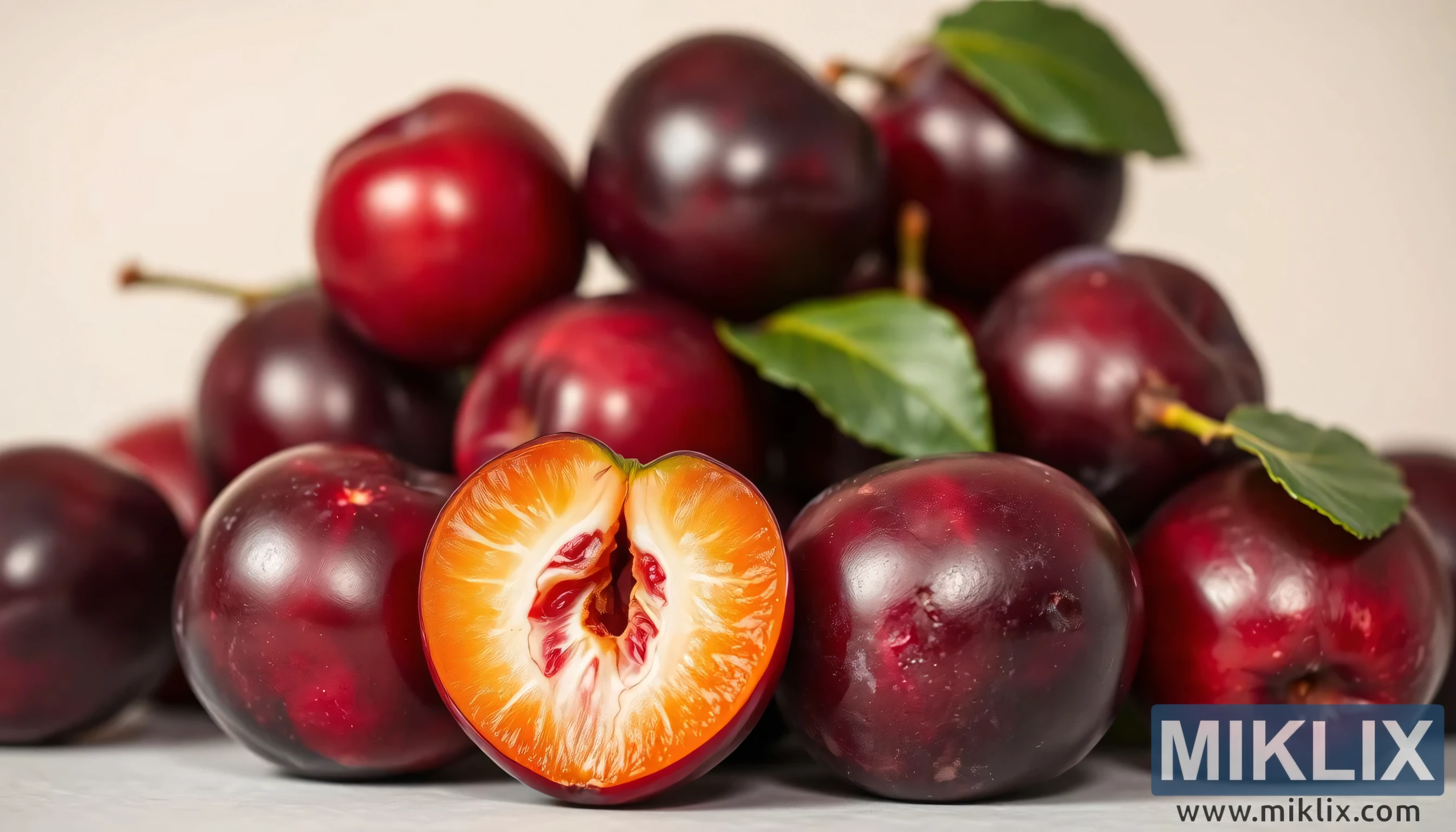 Under det mjuka skenet av naturligt ljus fokuserar bilden på den oemotståndliga charmen hos nyplockade plommon, arrangerade på ett sätt som får dem att se nästan ut som juveler i fruktträdgården. Deras släta, djupt lila skal skimrar med en glansig glans, vilket antyder den rikedom som finns inuti. Den centrala frukten, uppskuren för att avslöja sitt glödande gyllenorange fruktkött, drar ögat till sig med sin livfulla kontrast och visar upp den delikata färggradienten som övergår från en eldig bärnsten i kärnan till en mjukare gul i kanterna. Den subtila närvaron av karmosinröda ådror som omger kärnan i mitten framkallar idén om liv som flödar genom frukten, en påminnelse om den livfulla energi dessa plommon ger. Runt den vilar hela frukter i en generös klase, vissa prydda med färska gröna blad som fortfarande klamrar sig fast vid sina stjälkar, vilket understryker deras nyskörda fräschör och koppling till trädet.