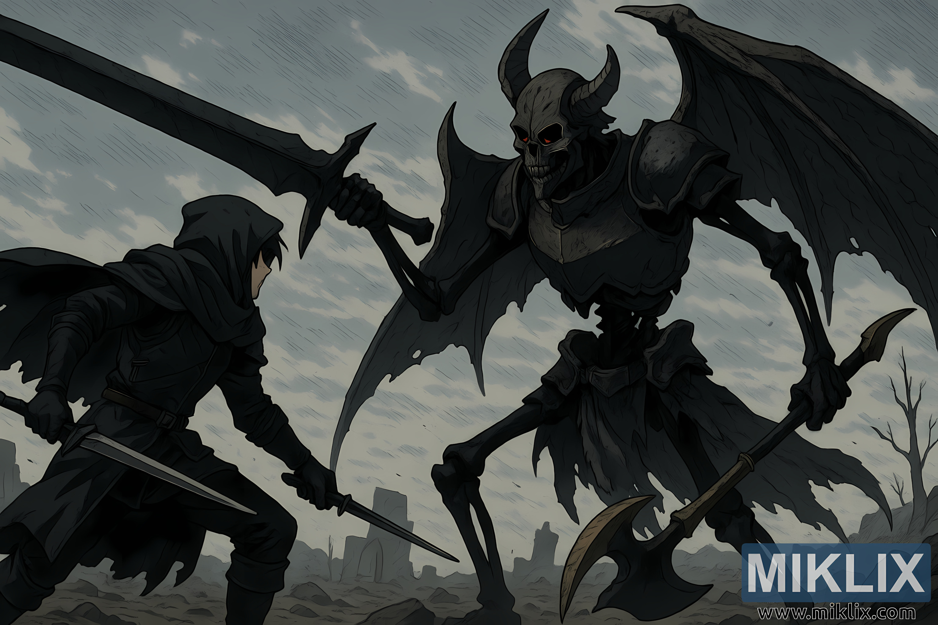 Denna anime-inspirerade fantasyillustration skildrar en dramatisk konfrontation mellan en ensam krigare och ett högt odödt monstruöst monster i ett kargt, vindpinat landskap. Kompositionen bär stark visuell spänning och placerar Tarnished – klädd i rustning i Black Knife-stil – på vänster sida av bilden, mitt emot den skelettliknande Black Blade Kindred som dominerar den högra. Den övergripande tonen är dyster, kall och atmosfärisk och frammanar en fientlig värld av förfall, aska och evig skymning.