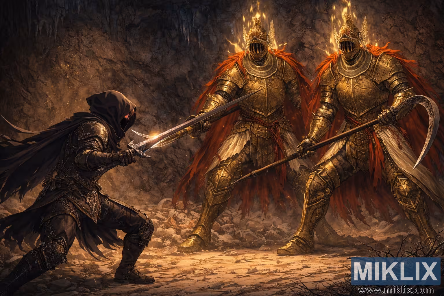 Riddaren till vänster greppar ett långt spjut, dess skaft vinklat diagonalt över ramen. Spjutspetsen är riktad mot den Tarnishedes dolk, de två vapnen frusna i ett ögonblick precis före träffen. Riddarens ställning är bred och stabil, knäna böjda under tunga skott, vilket antyder ett obevekligt framåtriktat tryck. Bredvid dem speglar den andre Cleanrot-riddaren deras storlek och kraft men svingar en massiv skära. Det böjda bladet böjer sig utåt och fångar grottans eldsken i en halvmåne av guld, positionerat för att svingas in från sidan och fånga den Tarnished mellan båda fienderna.