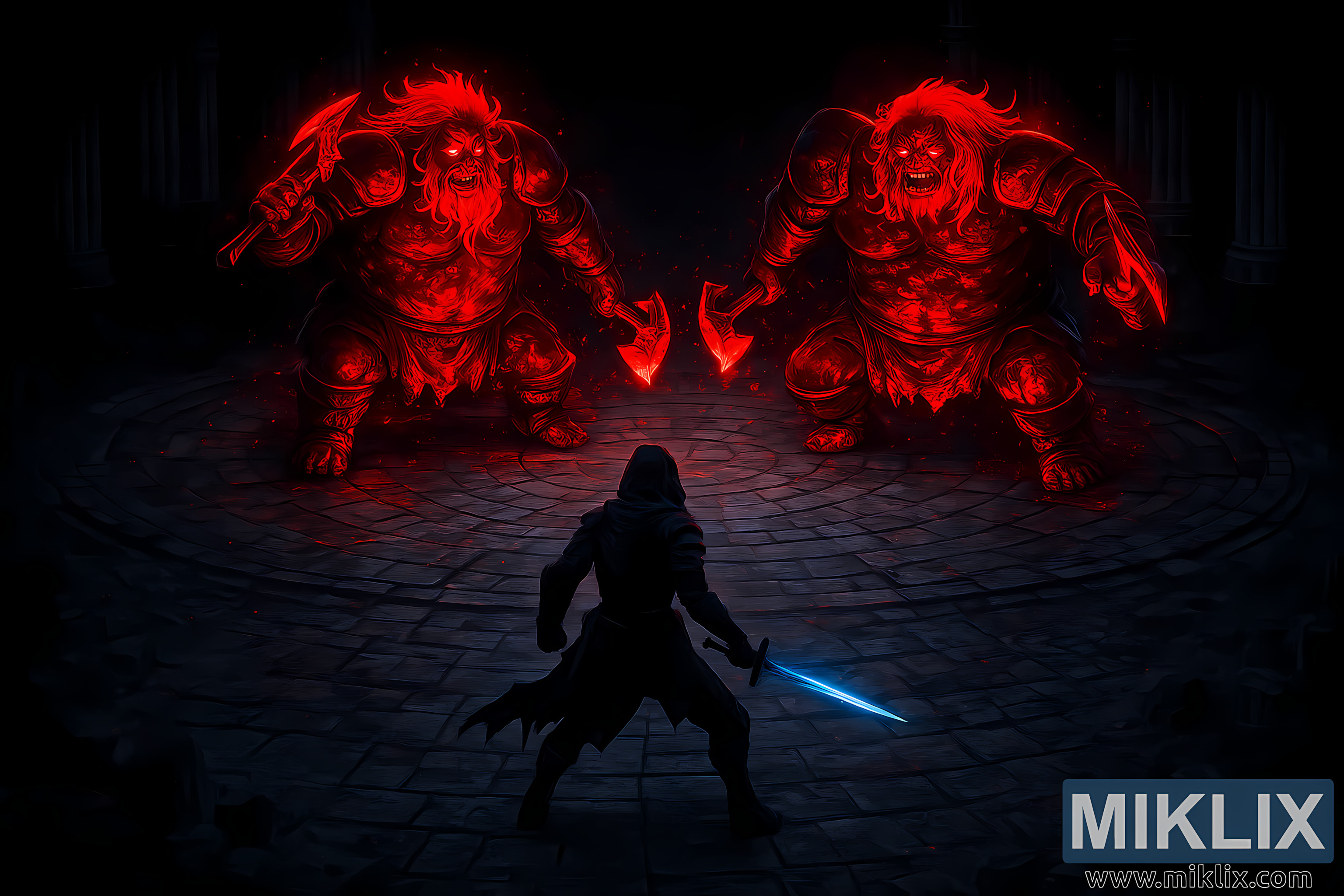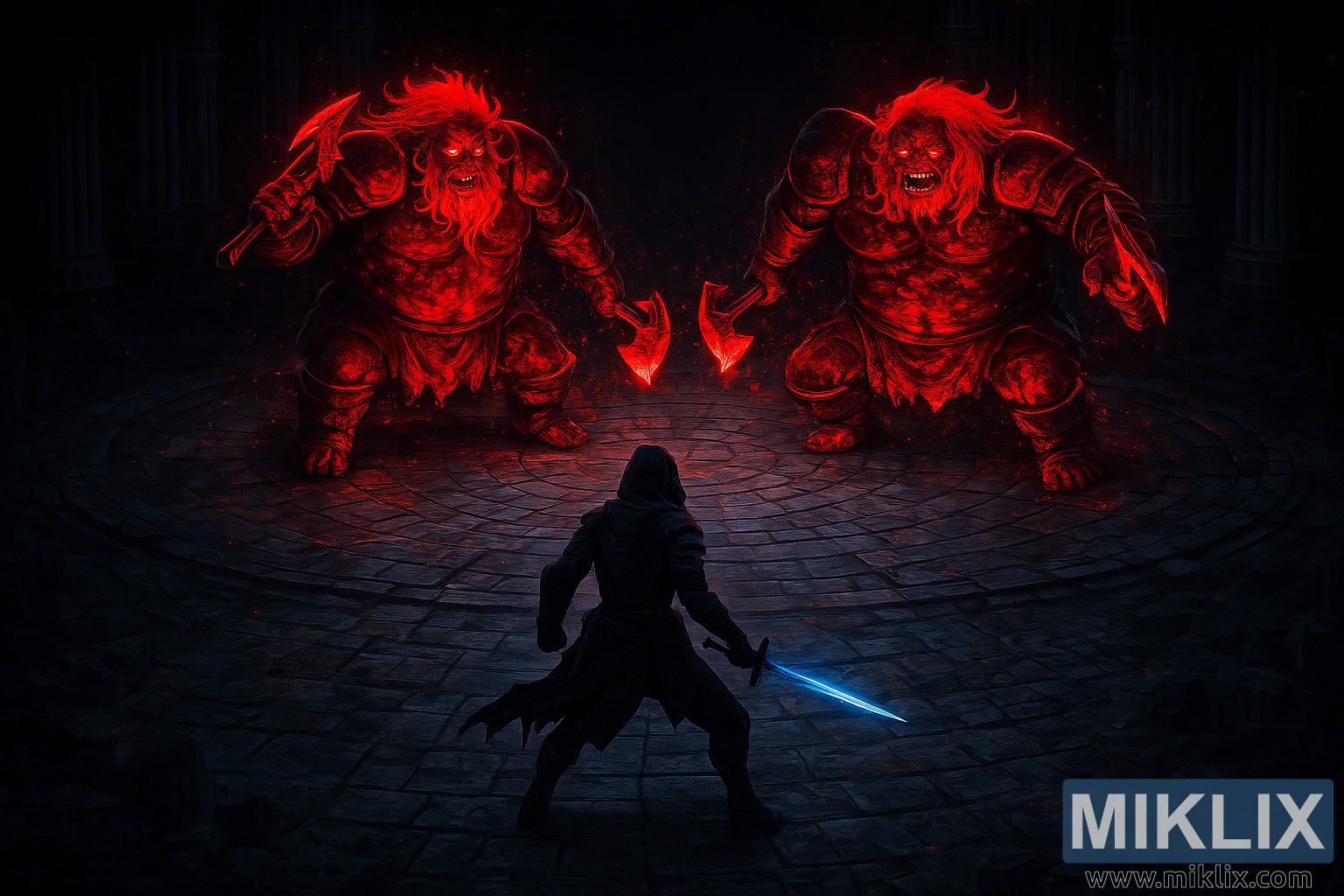 Mittemot honom står Fell Twins – massiva, groteska och brinnande röda som järn färskt från en smedja. Deras kroppar utstrålar ett våldsamt karmosinrött ljus, sprakande av aska som faller som brinnande damm och upplöses i mörker innan de vidrör sten. Deras hud och rustning böljar av smält textur, glödande inifrån som om de drivits av hat och förruttnelse. Varje tvilling greppar en massiv yxa, blad smidda i samma overkliga röda luminescens som deras kött, vassa som rituella avrättningsverktyg snidade ur själva vreden. Deras storlek överväldigar kompositionen – två jättar balanserade vid arenans bortre ände, deras närvaro bildar en dödens mur som väntar den ensamma stridande.