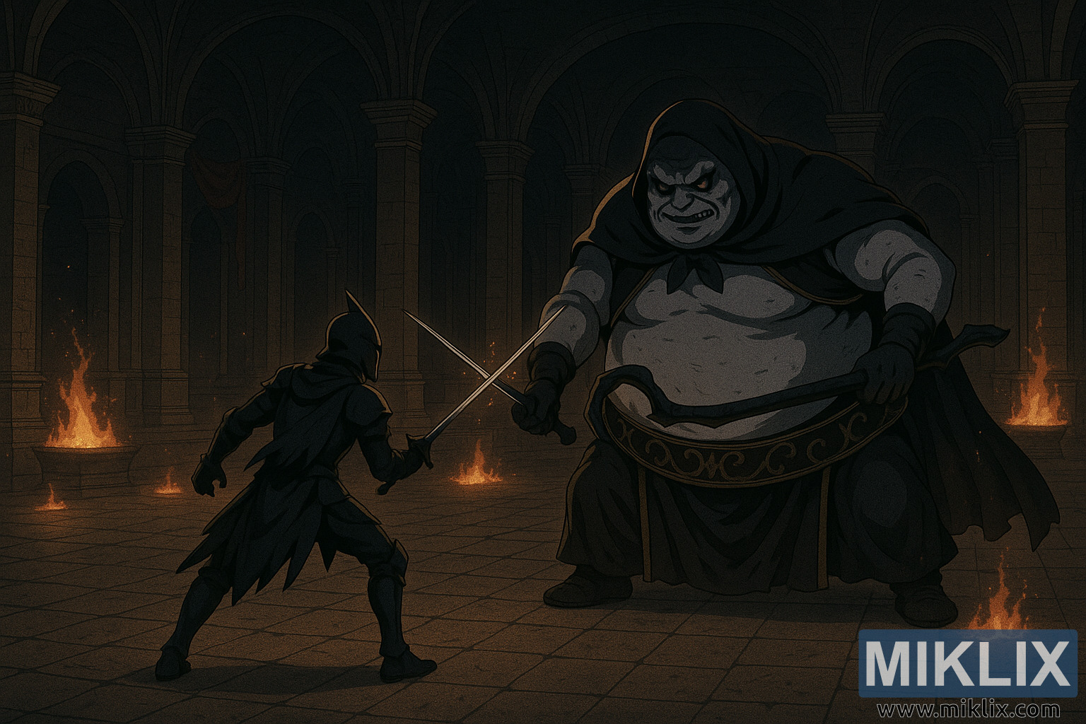 Mittemot står Gudhudens Ädelman – massiv, tornande och nu betydligt mer ondskefull. Deras uttryck är hotfullt, läpparna böjda i ett rovlystet flin som sträcker sig för brett över ett likblekt ansikte. Ögonen glöder av grym avsikt, insjunkna och skarpa under den djupa huvan av svarta dräkter som draperar över deras svullna kropp. Varje detalj i deras form antyder både arrogans och illvilja: köttvecken, det hårda greppet om den vridna, svarta ormstaven, det ceremoniella bältet runt deras midja mönstrat med guld. De lutar sig lätt framåt, som om de njuter av rädslan, säkra på sin storlek och styrka. Gapet mellan de två figurerna är brett, laddat med outtalat våld, och betraktaren kan känna striden balanserad på en rakbladsegg.