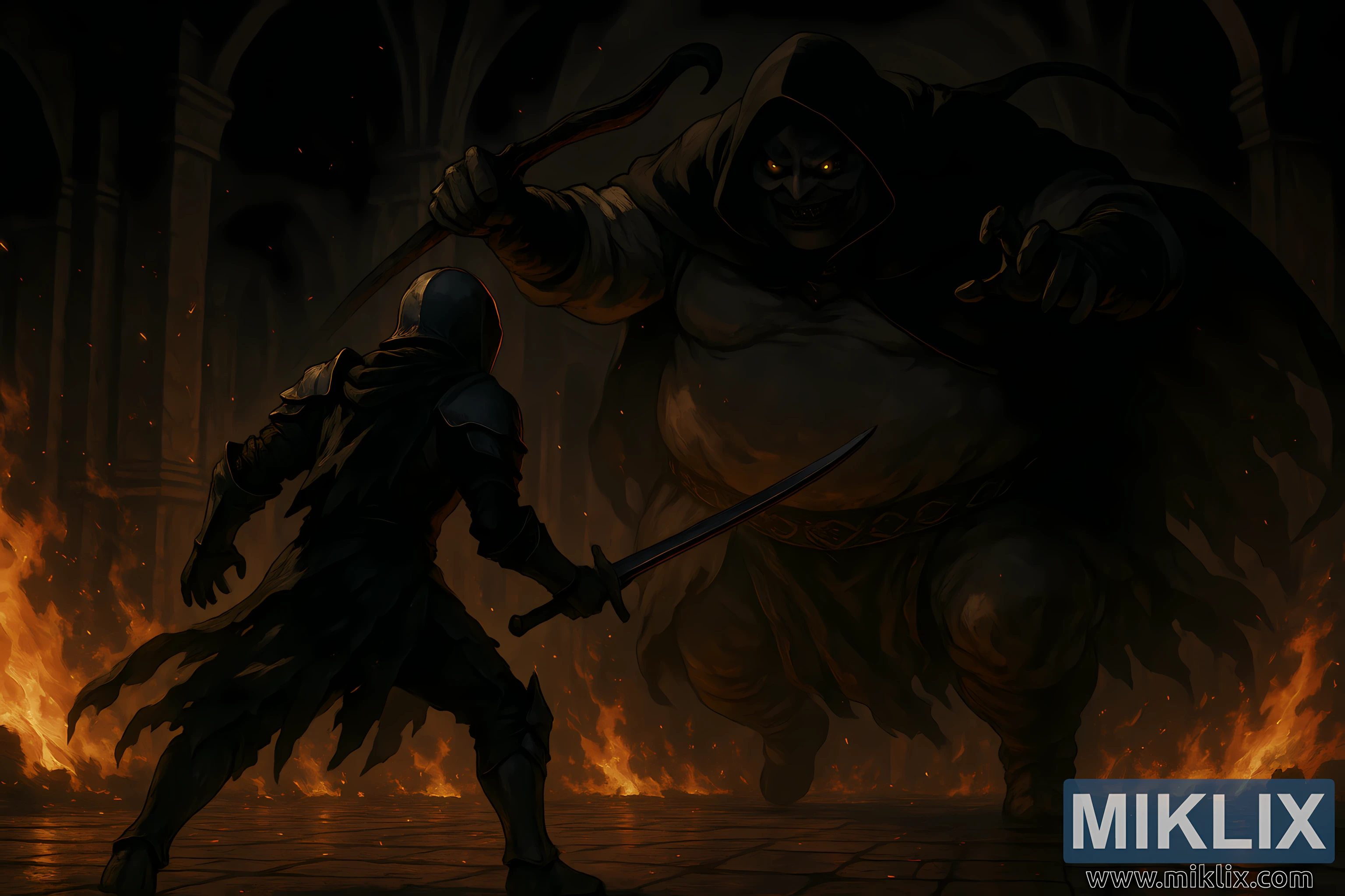 Scenen är bakgrundsbelyst av väggar av lågor – inte symbolisk eld, utan en dånande, djup, atmosfärisk eld som sprider sig över marmorgolvet i vågor av orange och glödande kolumner. Reflektionerna av brinnande ljus klamrar sig fast vid varje yta: rustning, kött, stenpelare, kvävande luft. Bakgrundsarkitekturen reser sig i stora valv och höga kolonner, knappt synliga genom lager av skuggor och rök, vilket ger djup och katedralliknande högtidlighet. Gnistor driver genom luften som döende stjärnor och påminner betraktaren om att allt här redan brinner – denna kamp utspelar sig inuti en kollapsande ugn av ruin.