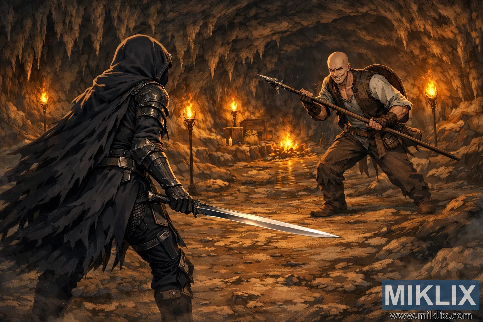 En högupplöst anime-liknande fantasyillustration fångar ett dramatiskt dödläge före striden inuti en vidsträckt underjordisk grotta inspirerad av Murkwater Cave. Kameran är tillbakadragen för att presentera en bredare, filmisk vy, vilket gör att mer av den steniga miljön och den atmosfäriska belysningen ramar in de två karaktärerna. Grotttaket välver sig högt ovanför, besatt med ojämna stalaktiter som liknar stenhuggtänder, medan grova mineraltexturer krusar väggarna. Flera facklor monterade längs sidorna kastar varma orangea lågor som dansar över de fuktiga ytorna, vilket skapar lager-på-lager-skuggor och lysande reflektioner på pölar utspridda över marken. Den övergripande belysningen blandar djupa bärnstensfärgade högdagrar med svalt, rökigt mörker, vilket framkallar en spänd, underjordisk stämning fylld av förväntan.