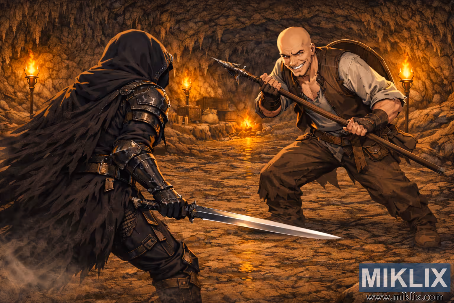 En högupplöst fantasyillustration i anime-stil skildrar en spänd strid före strid inuti en fackelupplyst underjordisk grotta inspirerad av Murkwater Cave. Scenen är inramad med ett något tillbakadraget filmiskt perspektiv som avslöjar en vidsträckt stenig miljö samtidigt som båda karaktärerna hålls framträdande i förgrunden. Grotttaket välver sig ovanför i lager av stenryggar, kantade med ojämna stalaktiter som liknar taggiga tänder. Varmt fackelljus flimrar från järnlampetter monterade längs väggarna och kastar krusande orangea detaljer över fuktiga mineraltexturer och skapar djupa fickor av skuggor mellan utskjutande stenar. Marken är ojämn och lerig, bruten av grunda reflekterande pölar som speglar de dansande lågorna och silhuetterna, vilket ger visuellt djup och atmosfär. Ett svagt dis av damm eller dimma dröjer sig kvar i luften, mjukar upp avlägsna kanter och ger grottan en fuktig, underjordisk känsla.