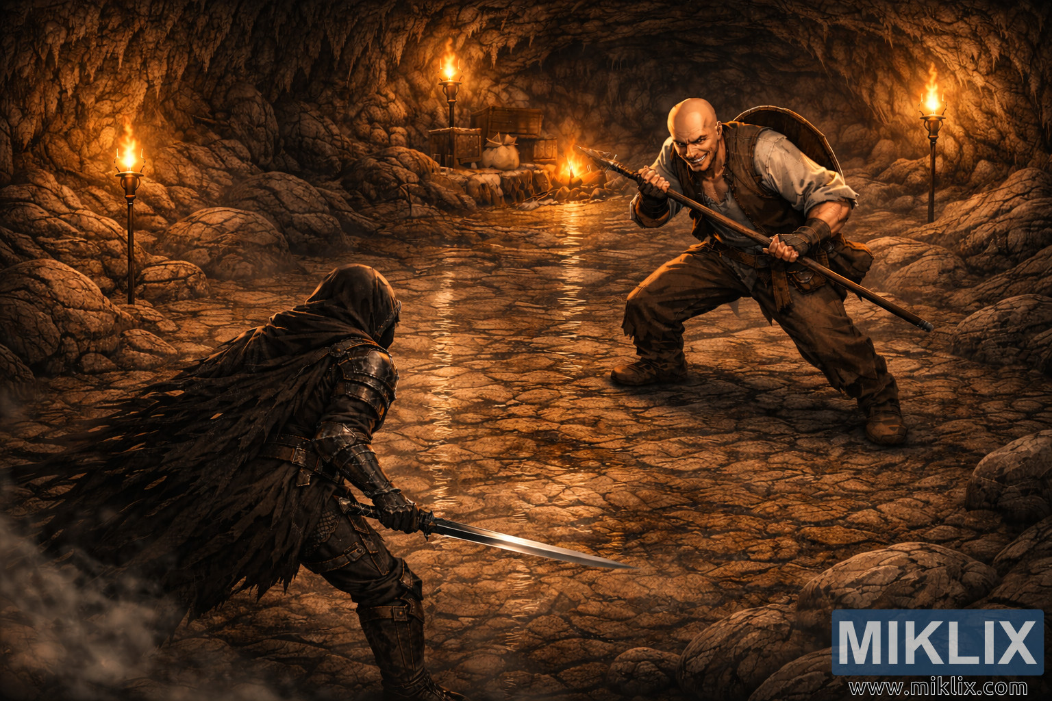 En semirealistisk digital fantasimålning presenterar en spänd konfrontation före strid inuti en vidsträckt underjordisk grotta, sett från ett något upphöjt, isometriskt perspektiv som avslöjar både karaktärerna och miljön i balanserad detalj. Kameravinkeln är dragna bakåt och höjda, vilket gör att betraktaren kan se ner över det ojämna stengolvet och in i grottans djupare skrymslen, vilket skapar en känsla av skala och rumslig medvetenhet. Grottans tak böjer sig ovanför i lager av bergsryggar, besatta med oregelbundna stalaktiter som liknar taggiga tänder. Järnlampetter kantar väggarna med jämna mellanrum, var och en håller en fackla vars orange låga flimrar och kastar krusande ljus över de fuktiga mineraltexturerna. Marken är sprucken, lerig och ojämn, avbruten av grunda reflekterande pölar som speglar facklans ljus och figurernas silhuetter. En svag slöja av dimma eller rök dröjer sig kvar nära golvet, mjukar upp avlägsna detaljer och förstärker den fuktiga, underjordiska atmosfären.