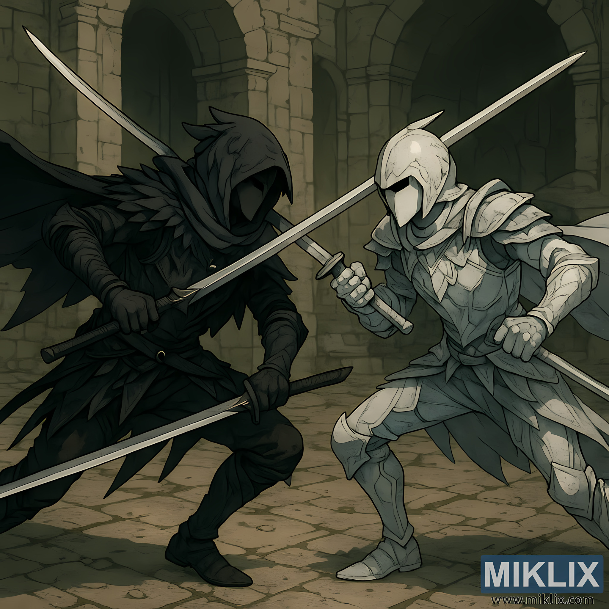 Slagfältet är en vidsträckt stenhall med höga pelare och välvda tak, putsade i dämpade gröngrå toner som ger en känsla av forntida förfall. Det spruckna stengolvet under deras fötter är ojämnt, märkt av århundraden av slitage. Ljus filtreras svagt genom osynliga öppningar och skapar dramatiska kontraster av skuggor och högdagrar över både figurerna och den slitna arkitekturen. Atmosfären känns tung, tyst och spänd, som om hela salen håller andan.