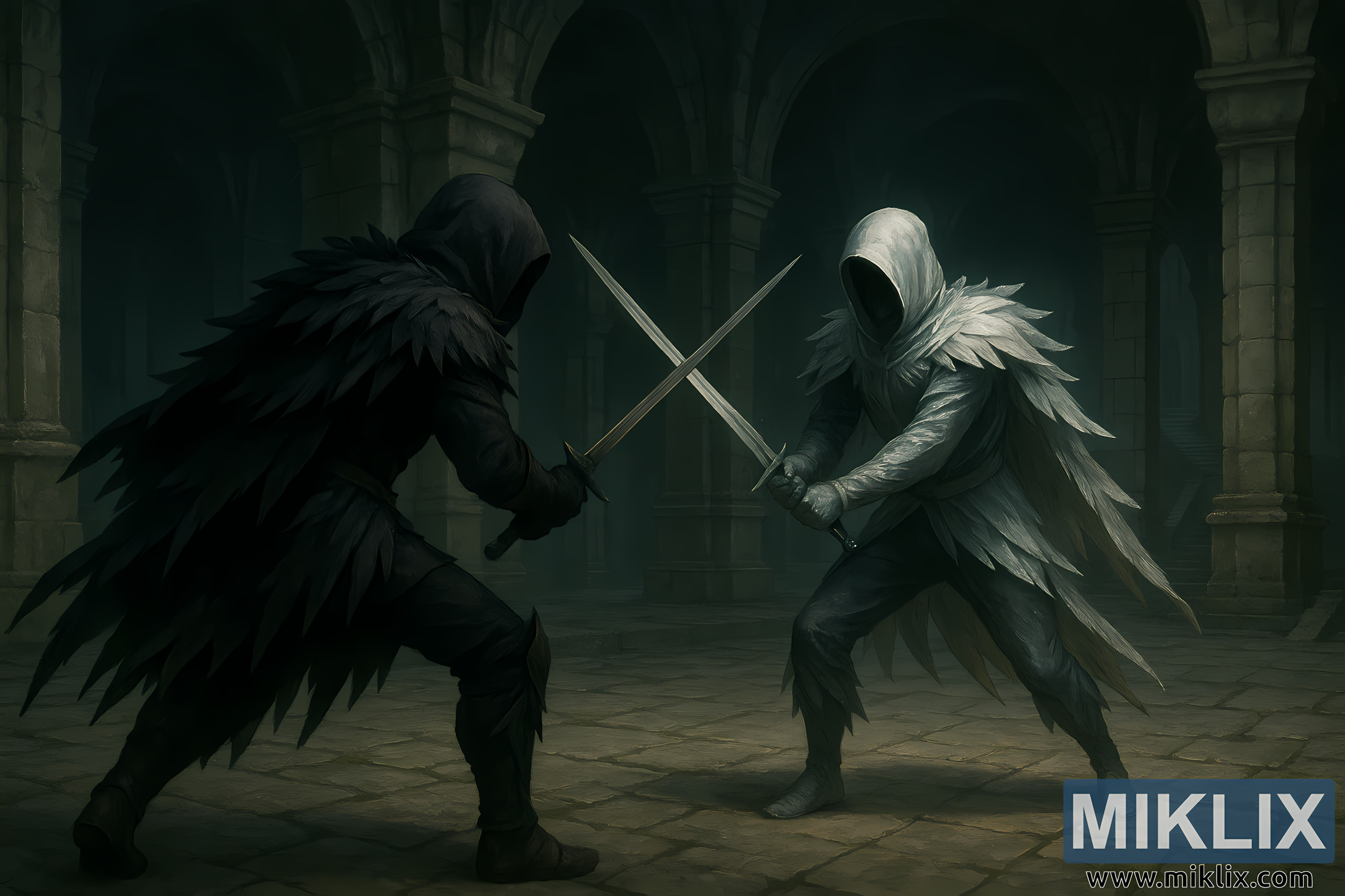 Deras blad möts i mitten av bilden, metall korsar metall i en spänd diagonal kollision. Ljuset betonar kontrasten mellan de två: den mattade absorberad av mörker och dämpade skuggor, den härmiska tåren konturerad i svagt sken. Subtila gnistor eller glimtar av reflekterat ljus löper längs kanterna på den silverfärgade härmarens svärd och antyder magisk kraft.
