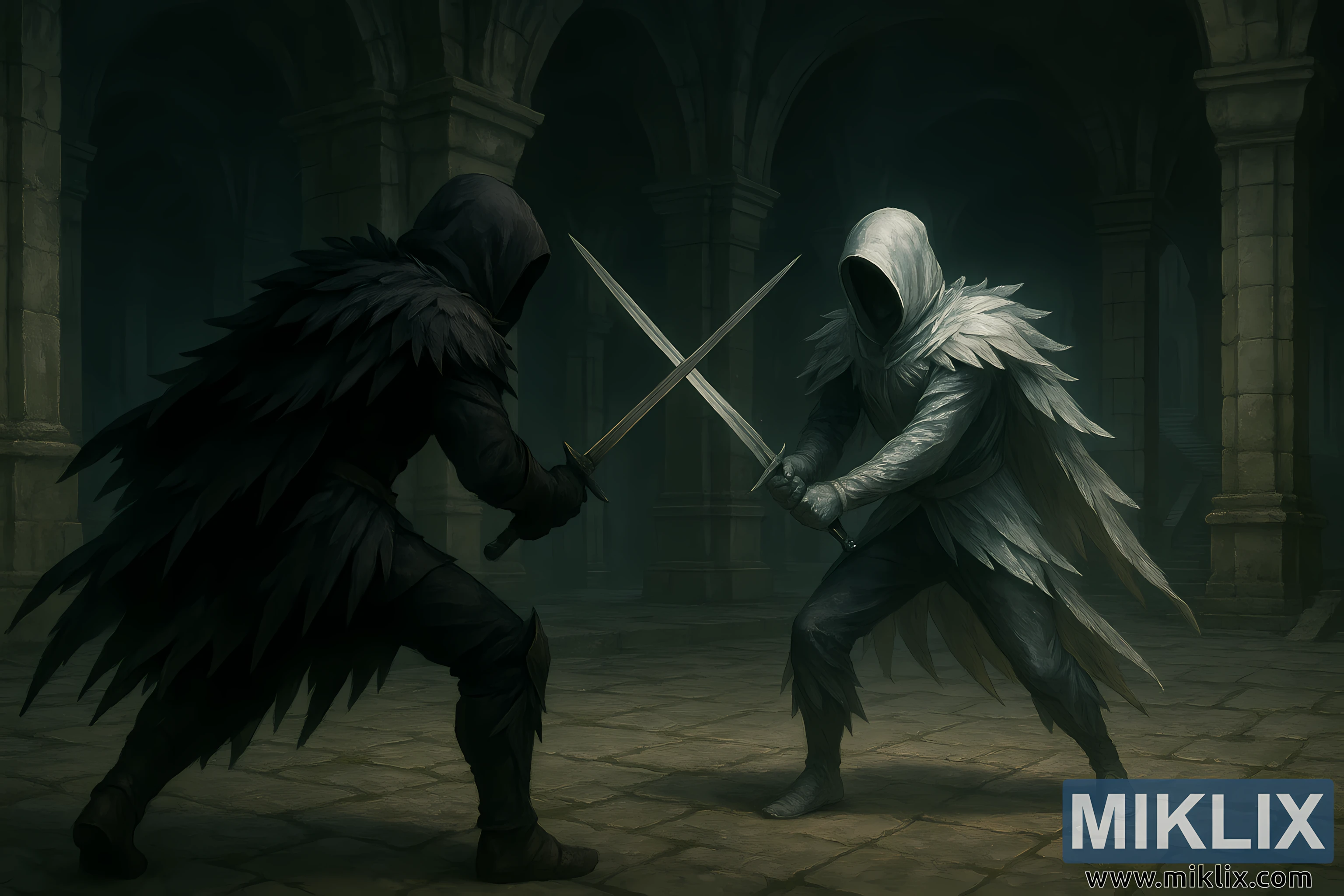 Denna semirealistiska, atmosfäriska illustration fångar en spänd och dramatisk duell mellan en Tarnished klädd i den ikoniska Black Knife-rustningen och hans kusliga silverfärgade motsvarighet – Mimic Tear – i de ekande djupen av en forntida underjordisk hall. Kompositionen har subtilt förskjutits så att betraktaren ser spelarkaraktären från en delvis bakåtriktad, trekvartsvinkel, vilket förstärker känslan av intimitet och intensitet. Hans mörka befjädrade mantel sveper utåt i lager på lager, taggiga former, där varje fjäderliknande segment återges med fina detaljer som avslöjar subtil fransning, ansamlat damm och tygrörelser som fryst mitt i handlingen. Tarnished har en aggressiv och redo hållning: ett ben bakåtlutat för kraft och balans, båda händerna griper tag i hans dubbla klingor med en avmätt, dödlig avsikt.
