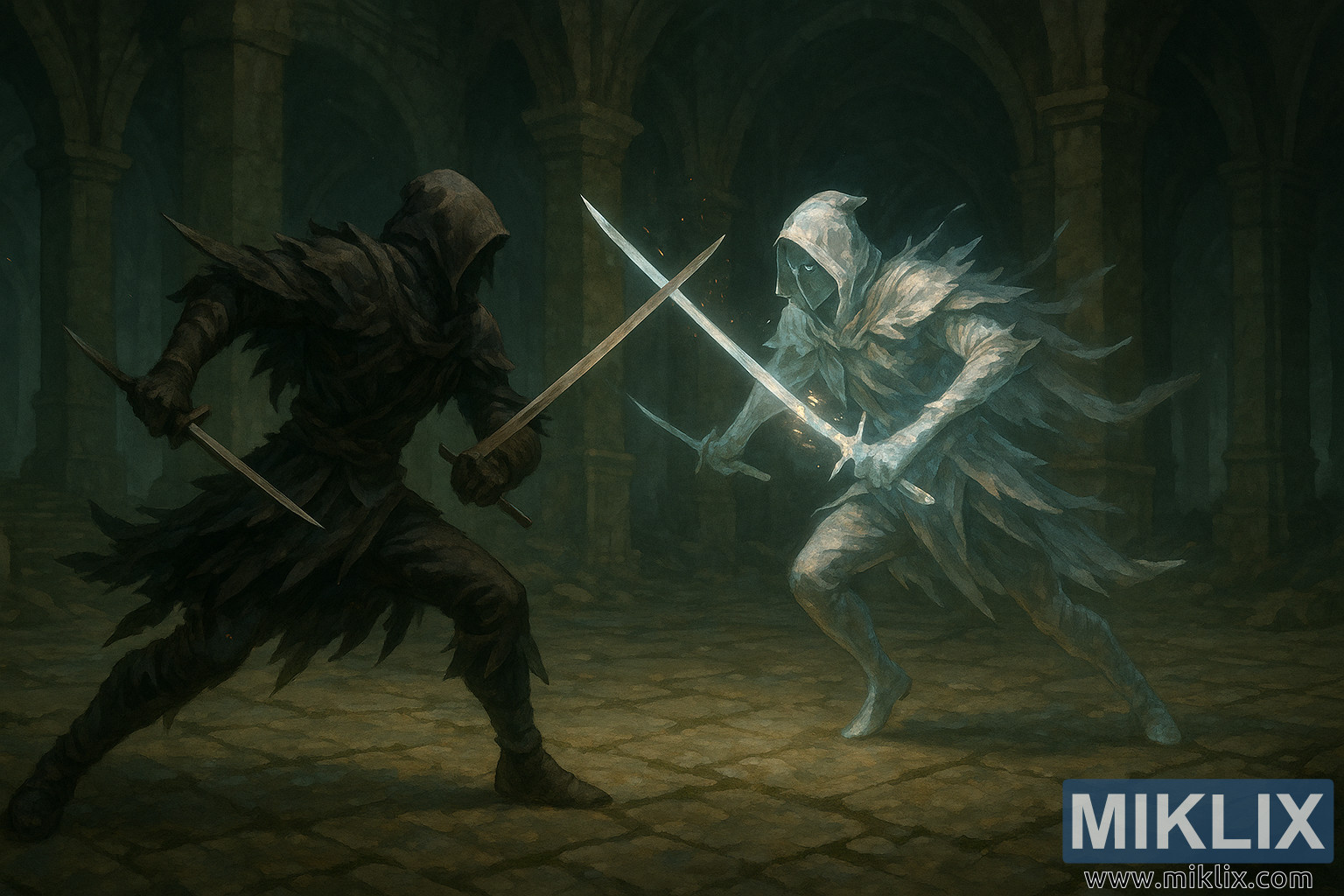 Denna semirealistiska illustration skildrar en dynamisk och mycket kinetisk duell mellan två kappklädda krigare djupt inne i en stor, gammal underjordisk hall. Miljön kännetecknas av höga stenvalv, spruckna marmorpelare och ett ojämnt kullerstensgolv badat i ett dämpat, grönaktigt dunkel. Kameran är tillräckligt utzoomad för att avslöja den vidsträckta arkitekturen – de svepande valven ovanför, de skuggade alkoverna och trapporna, och det spridda skräpet som antyder århundraden av förfall – men ändå tillräckligt nära för att hålla kämparnas rörelser och känslor skarpt i fokus.