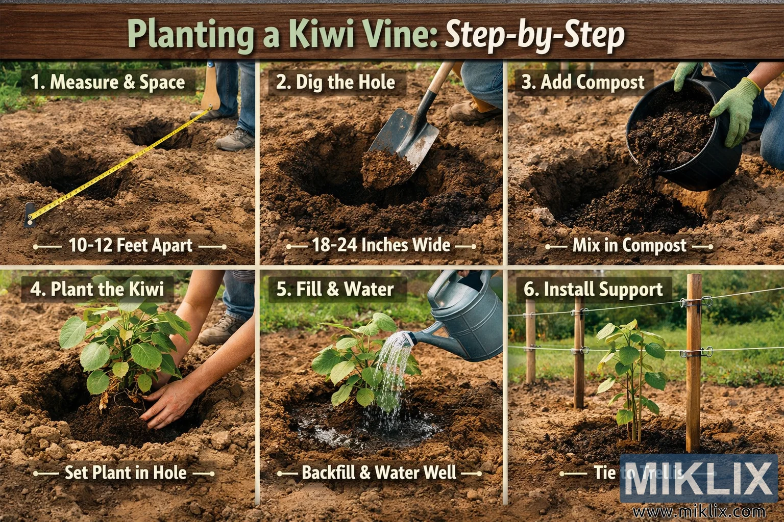Bilden är en bred, landskapsorienterad instruktionsvisual som presenteras som en enda komposition uppdelad i sex tydligt definierade paneler, arrangerade i två rader om tre. Längs upptill finns en rustik rubrik i träskyltstil med texten "Plantera en kiwi-vinranka: Steg för steg", vilket sätter en pedagogisk och praktisk ton. Färgpaletten är naturlig och jordig, dominerad av rik brun jord, grönt bladverk och trästrukturer, vilket ger scenen en realistisk trädgårdsmiljö. Panel ett illustrerar korrekt avstånd: en trädgårdsmästares ben och stövlar är synliga bredvid nygrävda hål i bar jord, med ett ljusgult måttband utspänt mellan dem. Överlagrad text och grafiska markörer indikerar det rekommenderade avståndet på cirka 3–3,6 meter, vilket betonar vikten av utrymme för vinstockars tillväxt. Panel två fokuserar på att gräva planteringshålet och visar en spade som skär i lös jord. Hålet verkar brett och djupt, med en tydlig etikett som anger en bredd på ungefär 45–60 cm, vilket visuellt förstärker korrekt planteringsdjup och förberedelse. Panel tre belyser jordförbättring och visar handskar som tippar en behållare med mörk, smulig kompost i hålet. Kontrasten mellan komposten och den omgivande jorden gör förbättringsprocessen tydlig och lätt att förstå. Panel fyra visar planteringshandlingen: en ung kiwi-ranka med ljusgröna blad sänks försiktigt ner i hålet av ett par händer, med rötterna noggrant placerade på rätt djup. Rankan ser frisk och upprätt ut, vilket kommunicerar korrekt hantering av växten. Panel fem demonstrerar återfyllning och vattning, med jord delvis fylld runt vinrankans bas medan en vattenkanna häller en jämn ström av vatten över jorden, vilket illustrerar den initiala bevattningen och rötternas sättning. Panel sex avslutar processen genom att visa installationen av en enkel stödstruktur. Trästolpar och horisontella trådar bildar ett spaljé, och den nyplanterade rankan är lätt bunden till stödet, vilket indikerar hur man styr tidig tillväxt. Varje panel innehåller koncisa bildtexter och enkla ikoner eller linjer som visuellt kopplar text till handling, vilket gör att hela bilden fungerar som en tydlig steg-för-steg-guide för nybörjare i trädgårdsodling. Sammantaget kombinerar bilden realistisk fotografi med instruktionsgrafik för att tydligt förklara avstånd, djup, jordberedning, plantering, vattning och initialt stöd för att framgångsrikt etablera en kiwi-ranka.
