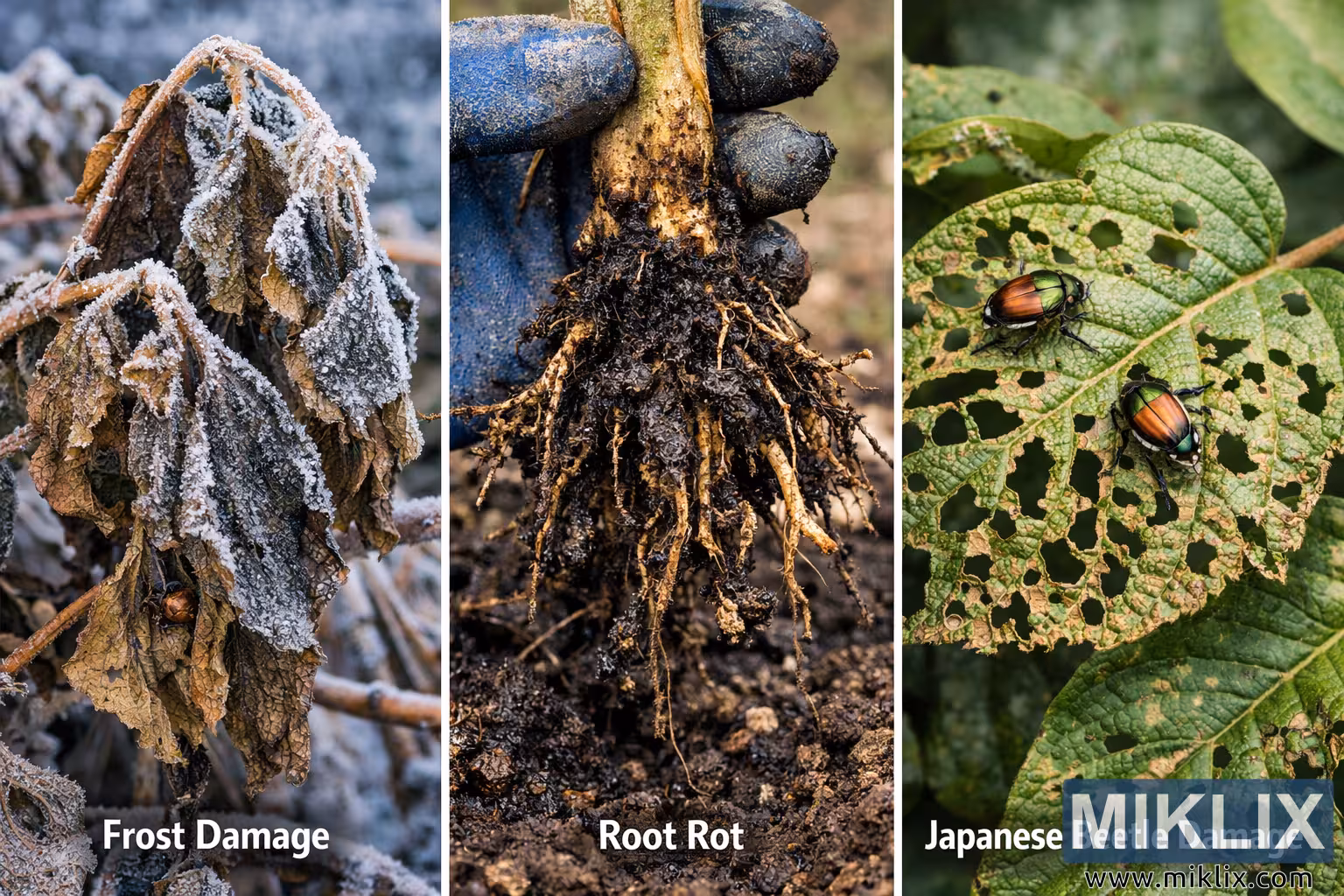 Högupplöst kompositbild som illustrerar vanliga problem med kiwiplantor, inklusive frostskador på bladen, rotröta under marken och skador på bladverket orsakade av japansk skalbagge.