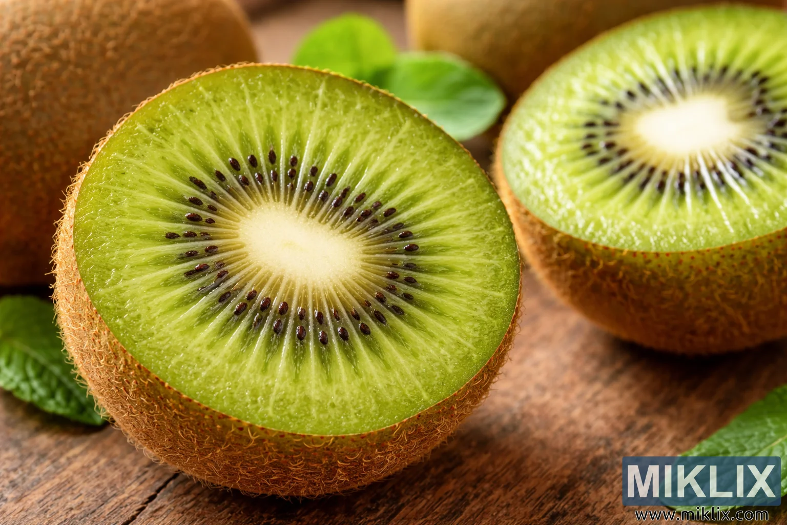 Bilden visar ett högupplöst, landskapsorienterat fotografi av nyskuren kiwi arrangerad på en rustik träyta, vilket betonar visuella indikatorer på korrekt skördemognad. I förgrunden visas en halverad kiwi i skarpt fokus, dess ljusa, genomskinliga gröna fruktkött strålar utåt från en blek, krämvit kärna. Jämnt fördelat runt mitten finns en tydlig ring av små, glansiga svarta frön, vart och ett tydligt definierat och inbäddat i fina, ljusare gröna strimmor som sträcker sig mot fruktens ytterkant. Fröna verkar fullt utvecklade och jämnt mörka, en viktig visuell ledtråd som förknippas med mogen kiwi redo för konsumtion eller hantering efter skörd. Fruktens yttre skal är ljusbrunt och luddigt och bildar en tunn texturerad kant runt det livfulla insidan. Lätt ytfukt och subtila höjdpunkter på fruktköttet antyder fräschör och saftighet, vilket förstärker känslan av naturlig mognad. I mitten och bakgrunden är ytterligare hela och halverade kiwifrukter placerade i små vinklar, mjukt oskarpa för att skapa djup utan att distrahera från huvudmotivet. Deras rundade former och dämpade bruna skal kontrasterar mot den livfulla gröna färgen på de skurna ytorna. Några färska myntablad är utspridda i närheten, vilket ger en kompletterande grön ton och förstärker intrycket av fräschör och naturlig kvalitet, även om de förblir sekundära element i kompositionen. Träbakgrunden består av varma bruna plankor med synlig ådring och lätt slitage, vilket ger en jordnära, jordbruksmässig kontext som stämmer överens med teman som skörd, produktkvalitet och livsmedelsvetenskap. Belysningen är mjuk och jämn, troligen naturlig eller diffus, vilket minimerar hårda skuggor samtidigt som den accentuerar kiwins färgmättnad och de fina detaljerna i fröna och fruktköttet. Den övergripande kompositionen balanserar klarhet och estetisk tilltalande effekt, vilket gör bilden lämplig för pedagogisk, vetenskaplig eller kommersiell användning där visuell bekräftelse av kiwifruktens mognad är viktig. Fotografiet kommunicerar effektivt mognad genom färgintensitet, fröutveckling och texturdetaljer, och erbjuder en tydlig, realistisk representation av en skuren kiwifrukt vid optimal skördemognad.