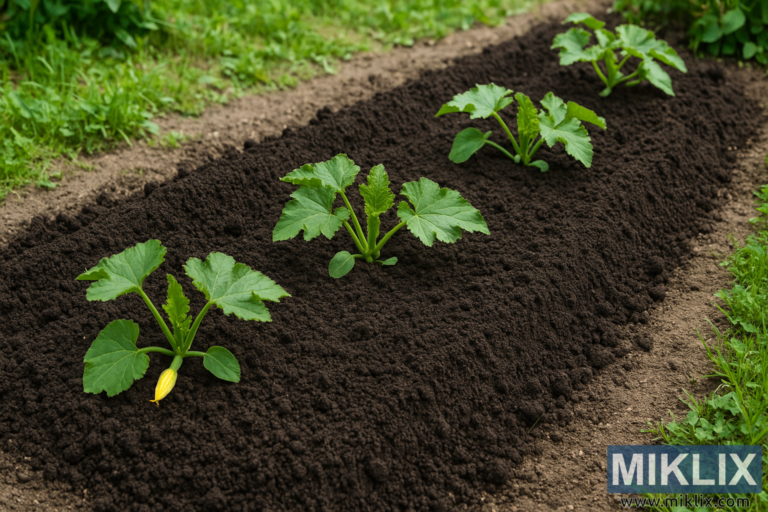 En väl förberedd trädgårdsbädd med näringsrik mörk jord och unga zucchiniplantor, som visar upp hälsosam tidig tillväxt i en frodig utomhusmiljö.