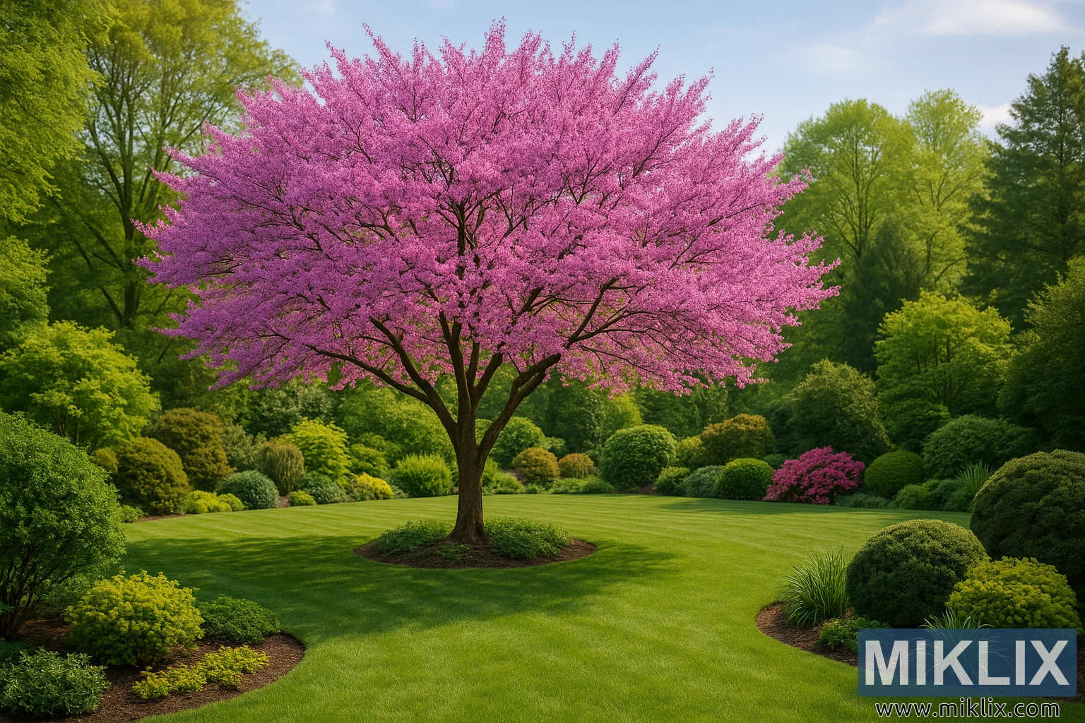 Ett fantastiskt rödknoppsträd i full blom fungerar som mittpunkt i en noggrant utformad trädgård, omgiven av trimmade buskar, ljust bladverk och en fridfull naturlig miljö.