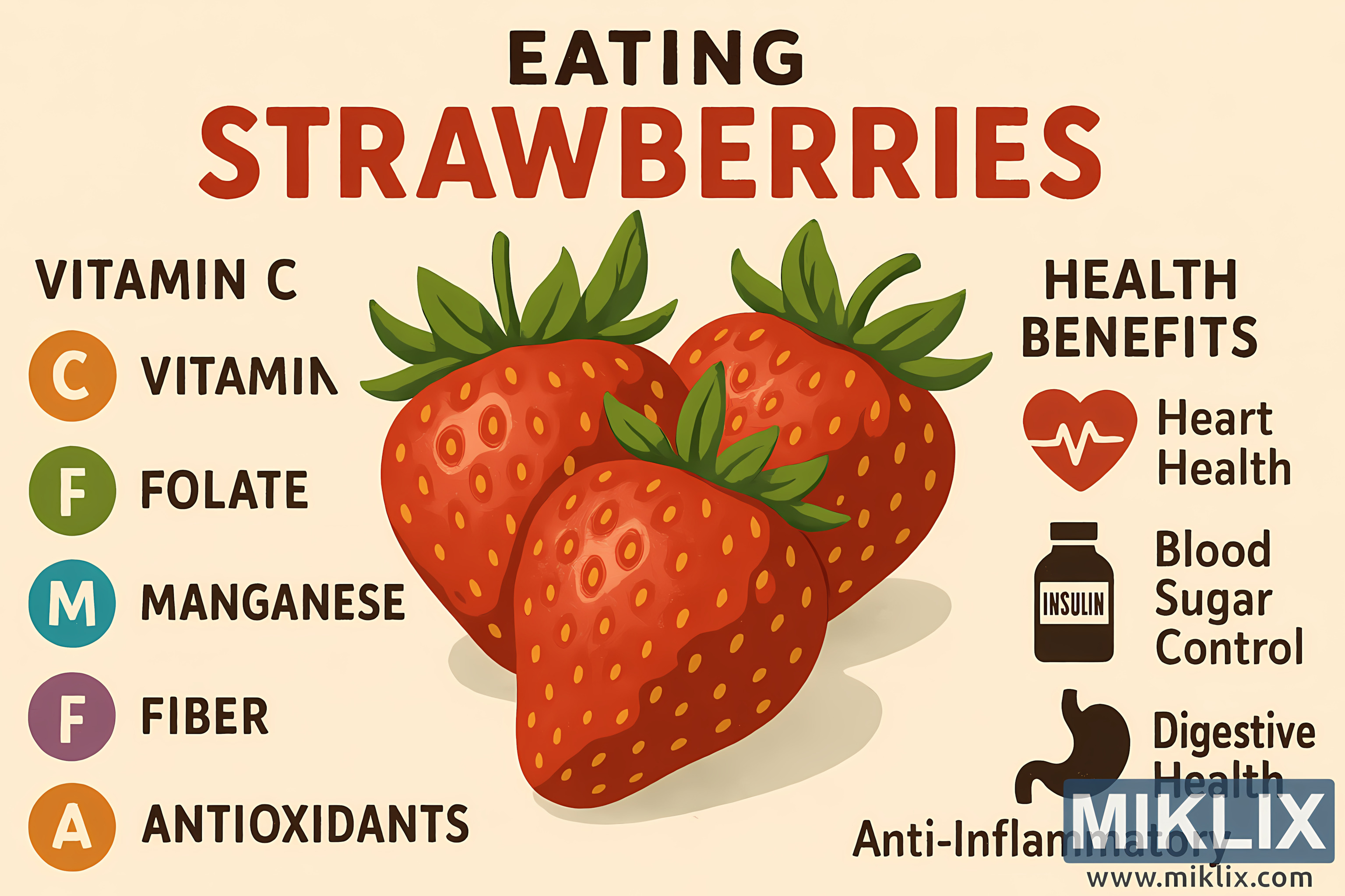 Mchoro huu wa mandhari wenye ubora wa hali ya juu unatoa muhtasari mzuri na wa kielimu wa sifa za lishe na faida za kiafya za kula jordgubbar. Katikati ya muundo huo, jordgubbar tatu kubwa zilizoiva zinaonyeshwa katika rangi nyekundu nyingi zenye mbegu ndogo za manjano na majani mabichi ya kijani kibichi. Uso wao wenye umbile kidogo na kivuli cha asili huzipa mwonekano halisi na wa kuvutia.
