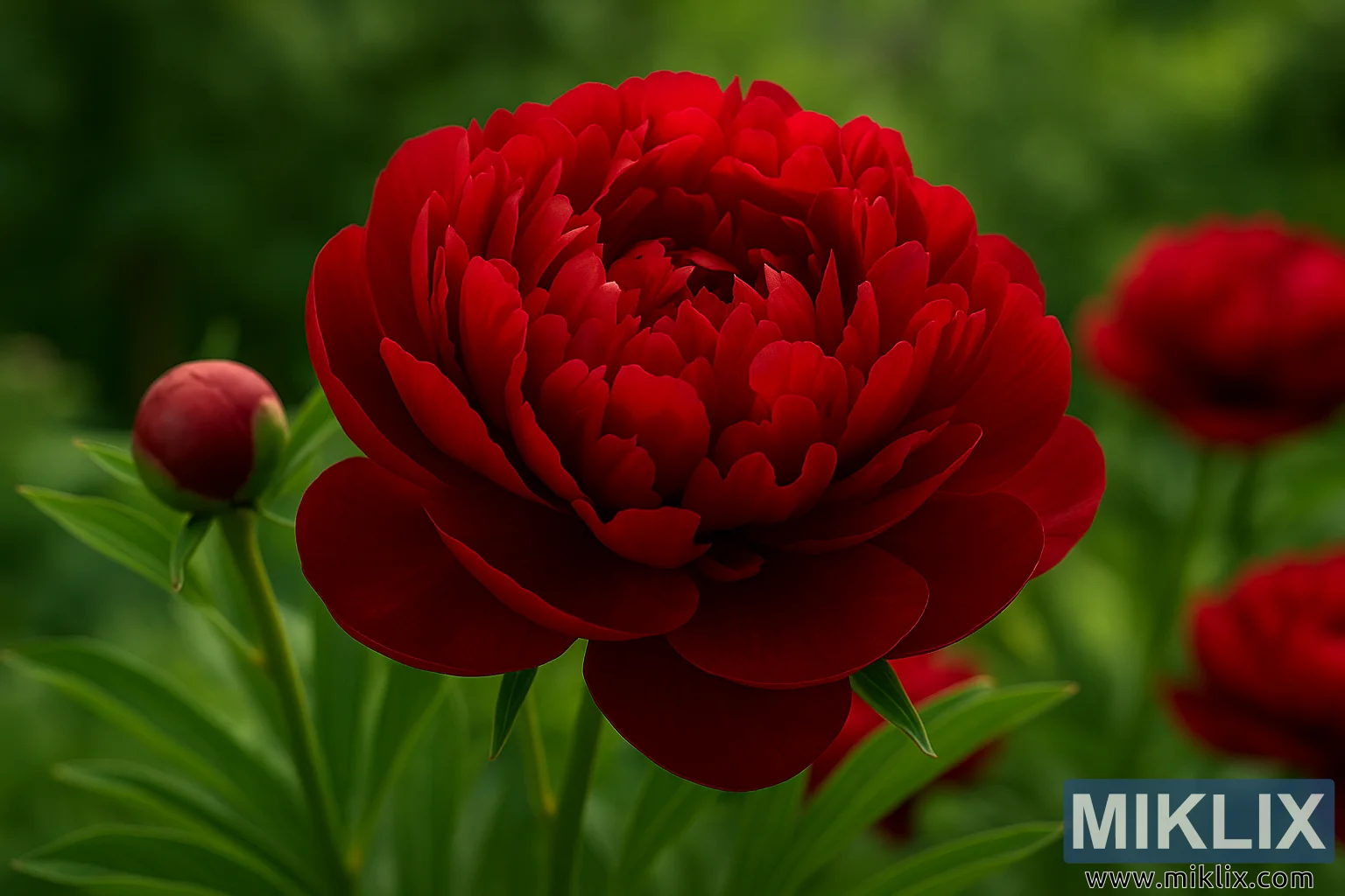 Kuzunguka maua ya msingi ni vidokezo vya mazingira ya asili ya peony. Majani ya kijani kibichi, ya lanceolate yanainuka juu, na kutoa tofauti ya kijani kibichi na nyekundu kali ya ua. Huku nyuma, machipukizi yaliyo na ukungu kidogo na maua yaliyofunguka kidogo yanadokeza mpangilio mpana wa bustani, ikipendekeza kitanda cha peony kinachostawi katika majira ya kuchipua au mwanzoni mwa kiangazi. Chipukizi moja ambalo halijafunguliwa, linaloonekana kando ya ua kuu, hutoa masimulizi mafupi ya ukuaji na uwezekano, huku bendera iliyotiwa ukungu ikijitokeza kwa umbali kutoa kina na muktadha kwa utunzi.