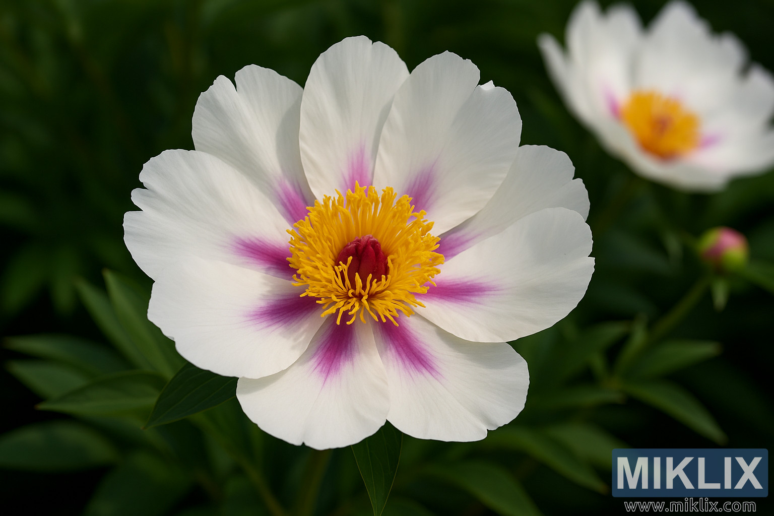 Picha inaonyesha ukaribu wa kuvutia wa peony ya makutano ya Cora Louise (Paeonia × itoh 'Cora Louise'), aina nzuri ya kipekee na inayotafutwa sana inayoadhimishwa kwa umbo lake maridadi la maua, utofautishaji wa rangi wa hali ya juu, na utendakazi wa kipekee wa bustani. Katikati ya utungaji ni maua moja, yaliyofunguliwa kikamilifu, yaliyotekwa kwa undani wa kushangaza. Petali zake kubwa, nusu-mbili hung'aa kwa ulinganifu wa kupendeza, na kuunda silhouette laini na ya mviringo ambayo huvutia jicho ndani hadi moyo wa ua.