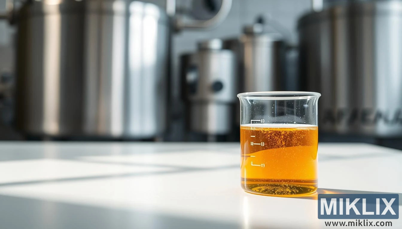 Juu ya uso mweupe wa benchi ya maabara isiyo na doa hukaa kopo la glasi, rahisi kwa umbo ilhali limebeba uzito wa ufundi na sayansi. Kuta zake zenye umbo la silinda huinuka kwa uwazi kabisa, na ndani yake huangaza umajimaji wa kaharabu unaoshika nuru kama asali iliyong'olewa. Viputo vidogo huinuka kwa mwendo wa taratibu, vijikidogo, viking'ang'ania kwa muda mfupi kioo kabla ya kukatika, kikumbusho cha hila cha shughuli isiyoonekana ndani. Hii si sampuli ya kioevu tu, bali ni kielelezo cha utayarishaji wa chachu-myeyusho wa chachu ya SafAle F-2, muhimu kwa michakato ya pili ya uchachishaji na uwekaji hali katika utayarishaji wa pombe. Umeme unaometa juu ya uso na mng'ao hafifu huzungumza na tabia yake hai, hai na viumbe vidogo vidogo ambavyo hubadilisha wort kuwa bia, sukari kuwa pombe, na uwezo wa kuwa bidhaa iliyokamilishwa.