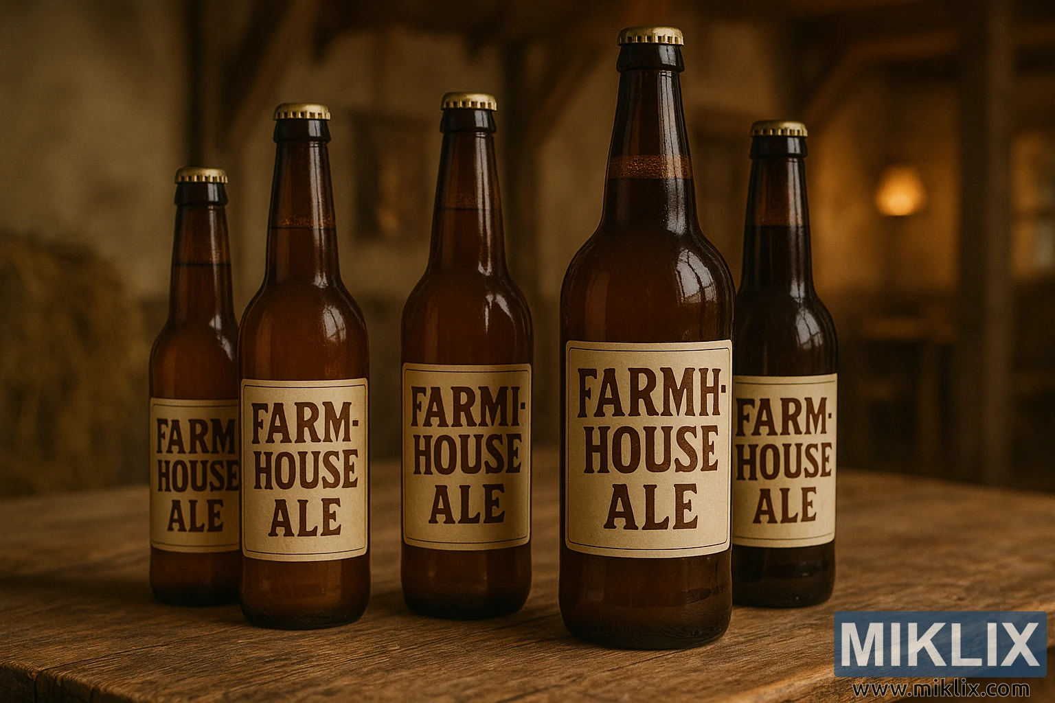 Katikati ya picha, chupa tano za glasi za kahawia zenye urefu tofauti zimepangwa kwa safu kidogo, na kuunda kina na kuchora jicho la mtazamaji kutoka mbele hadi nyuma. Kila chupa ina lebo kubwa iliyotengenezwa kwa mikono yenye maneno "FARMHOUSE ALE" kwa herufi nzito, ya serif. Maandishi yamechapishwa kwa wino wa kahawia wa joto kwenye karatasi ya rangi ya krimu, iliyo na maandishi ambayo inahisi kutumika kwa mkono - inayoangazia roho ya DIY na asili ya ufundi ya utengenezaji wa pombe kwenye nyumba ya shamba. lebo si flashy au biashara; badala yake, yanaibua imani tulivu, yenye msingi, kana kwamba imeundwa kwa ajili ya jumuiya ya karibu ya wajuzi badala ya rafu za soko kubwa.