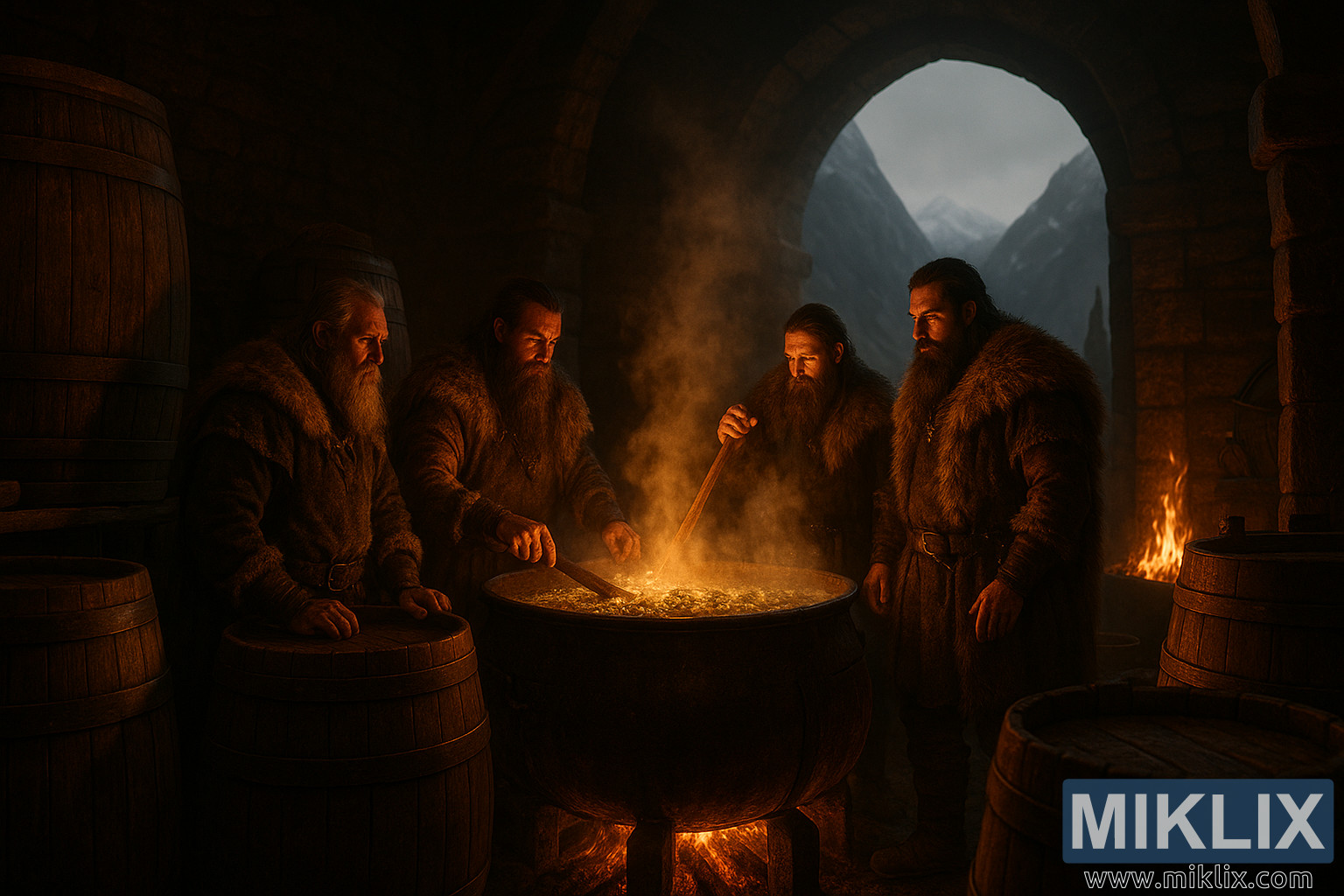 Ndani ya ukumbi wa kivuli wa kile kinachoweza kufikiriwa kama kiwanda cha pombe cha Viking, tukio linajitokeza kwa hisia ya ibada ya kale, sehemu sawa za ufundi wa vitendo na sherehe za kitamaduni. Ufifi wa chumba huvunjwa na moyo unaong'aa wa muundo: sufuria kubwa iliyowekwa juu ya moto unaonguruma, uso wake unabubujika na kuanika huku humle na nafaka zikitoa kiini chake kwenye kioevu kinachochemka. Kuzunguka hilo kunasimama takwimu nne, nguo zao nzito za manyoya zimefunikwa kwenye mabega mapana, ndevu zao ndefu zikishikana na mwanga wa moto. Kila mwanamume anaonekana kuchongwa kutoka kwa jiwe lile lile lililochongwa vibaya na ukumbi wenyewe, nyuso zao zenye hali ya hewa zikiwa zimepambwa kwa umakini wanapotumia pombe yao. Mmoja anakoroga kimakusudi kwa kasia ndefu ya mbao, na kutuma viwimbi kwenye uso wa sufuria, huku mwingine akiinamia karibu, usemi wake unaonyesha umakini na heshima kwa mchakato unaoendelea. Wengine wanatazama, wakingojea zamu yao ya kuongeza mguso wao kwenye uumbaji.