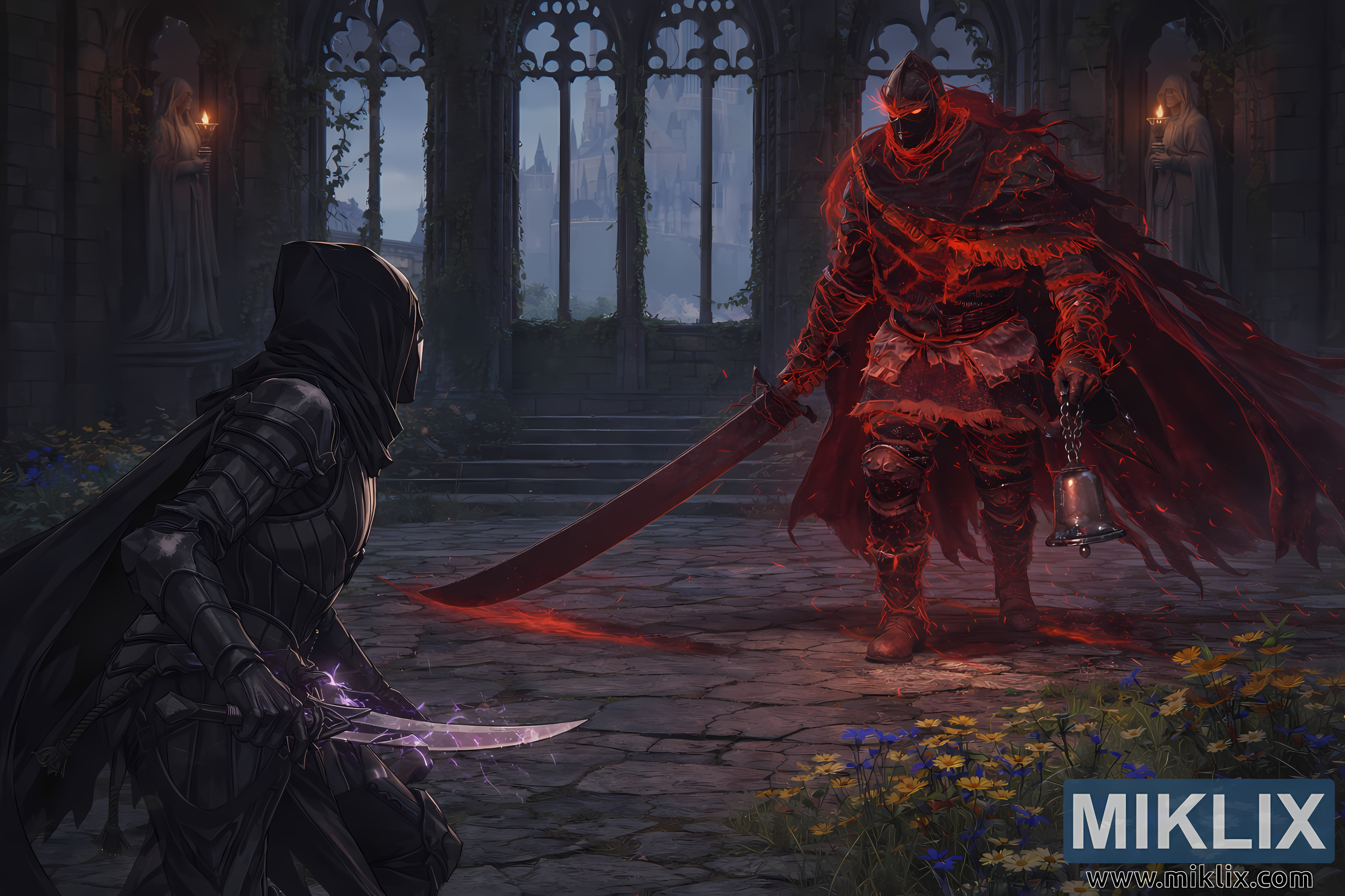Mkabala nao, akitawala upande wa kulia wa tukio hilo, anasimama Mwindaji Mwenye Kengele. Umbo lake limefunikwa na aura nyekundu inayozunguka ambayo inazunguka silaha zake kama makaa ya moto yaliyo hai. Mwangaza huo unaangazia mawe ya bendera yanayozunguka kwa mistari ya mwanga mwekundu, na kuacha njia hafifu huku nishati ikimwagika kutoka mwilini mwake. Katika mkono wake wa kulia anavuta blade kubwa iliyopinda ambayo ncha yake inakwaruza jiwe, huku upande wake wa kushoto ukining'inia kengele nzito kwenye mnyororo mfupi, uso wake wa chuma ukishika mwanga mwekundu kana kwamba unawaka moto kutoka ndani. Nguo yake ya kifahari inapepea nyuma yake kwa wimbi la polepole na la kutisha, likidokeza uwepo wa ajabu badala ya upepo rahisi.