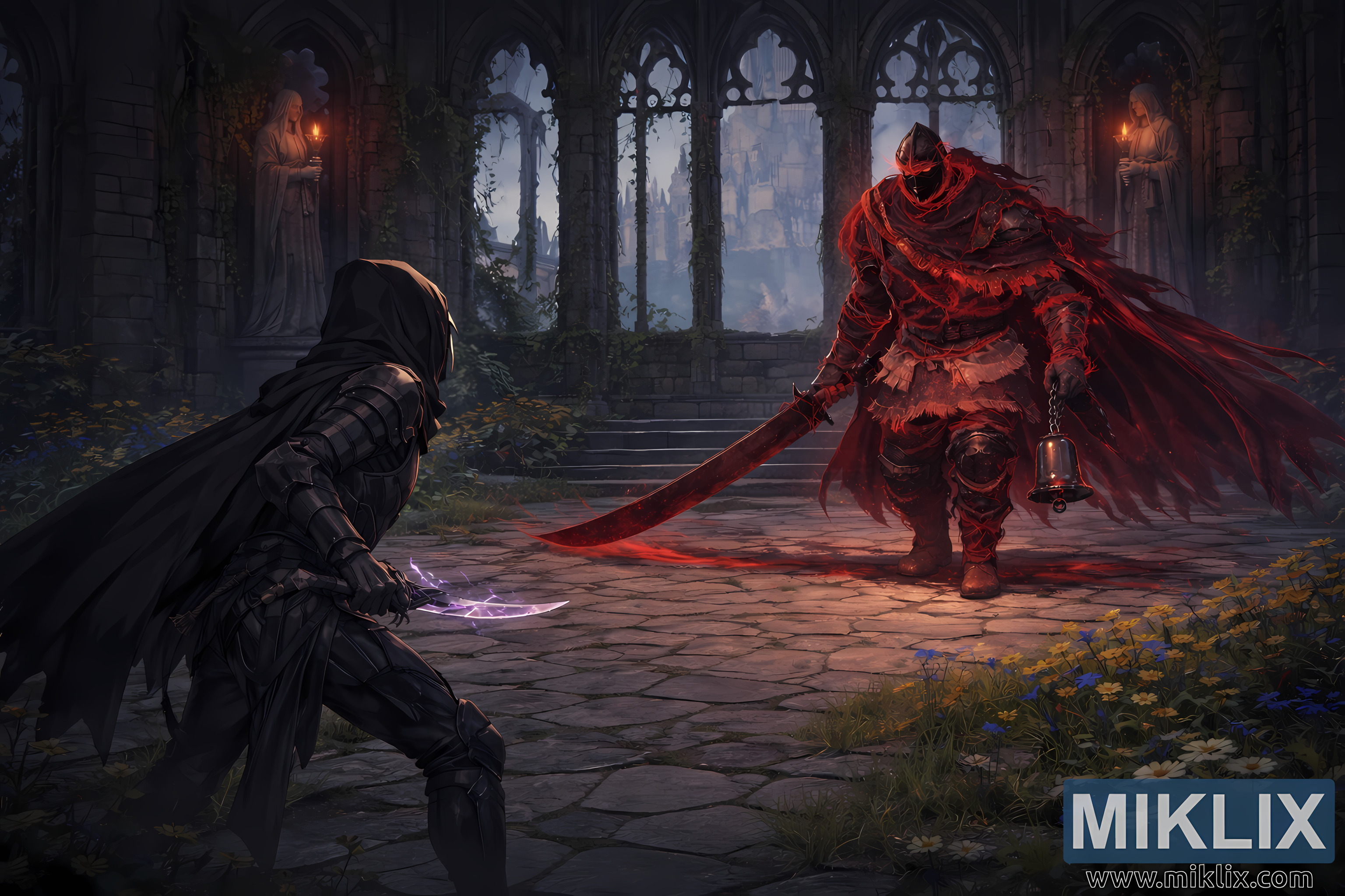 Asili huingilia kimya kimya magofu matakatifu: nyasi hugawanya vigae vya mawe, na makundi ya maua ya porini ya bluu na njano huchanua karibu na buti za Waliochafuliwa, rangi dhaifu dhidi ya sakafu baridi ya kijivu. Taa imesawazishwa kwa ustadi, huku mwanga wa asubuhi baridi ukiosha usanifu na Waliochafuliwa, huku Mwindaji akitoa joto jekundu linalowaka, na kusababisha mgongano mkubwa wa utulivu na tishio. Hakuna pigo lililopigwa bado, lakini mvutano hujaa hewa, kana kwamba kanisa lenyewe linashikilia pumzi yake katika mapigo ya mwisho ya moyo kabla ya chuma, uchawi, na hatima kugongana.