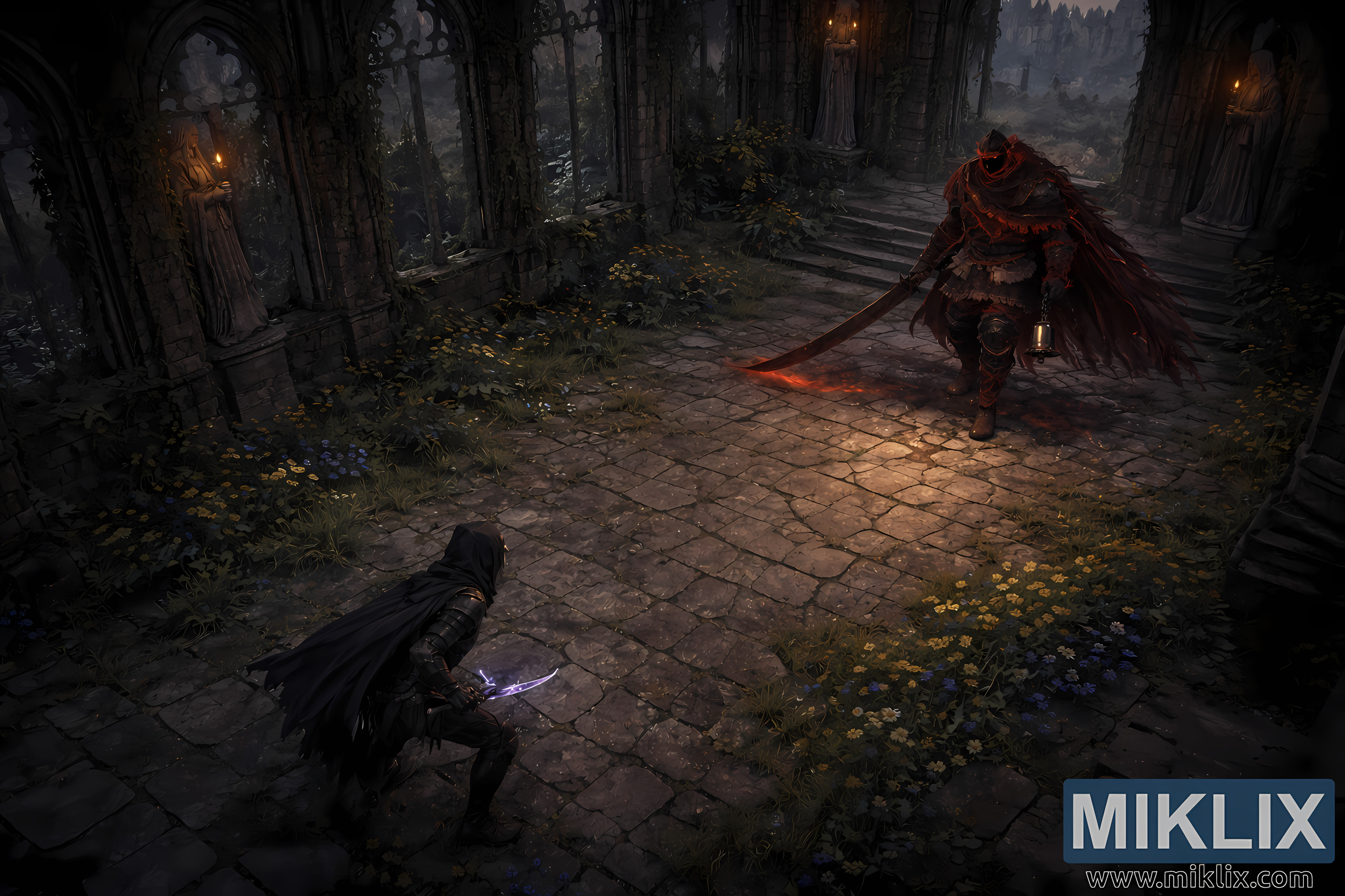 Asili imerudisha sakafu katika sehemu zilizotawanyika. Nyasi hupenya vigae vilivyovunjika, na makundi ya maua ya mwituni yanaonekana kwenye mandhari yenye manjano yaliyonyamaza na bluu hafifu, hasa kuzunguka kingo za fremu. Mwangaza ni mdogo na wa asili, huku mwanga wa jua ukichuja kutoka juu na aura ya Hunter nyekundu-kavu ikitoa lafudhi pekee yenye nguvu ya rangi. Kutoka kwa mtazamo huu wa juu, ukimya unahisi mzito zaidi kuliko hapo awali, takwimu hizo mbili zimepunguzwa vipande vipande kwenye ubao mkubwa, mtakatifu, zimefungwa katika wakati wa mgongano usioepukika kabla ya mgomo wa kwanza kuvunja utulivu.