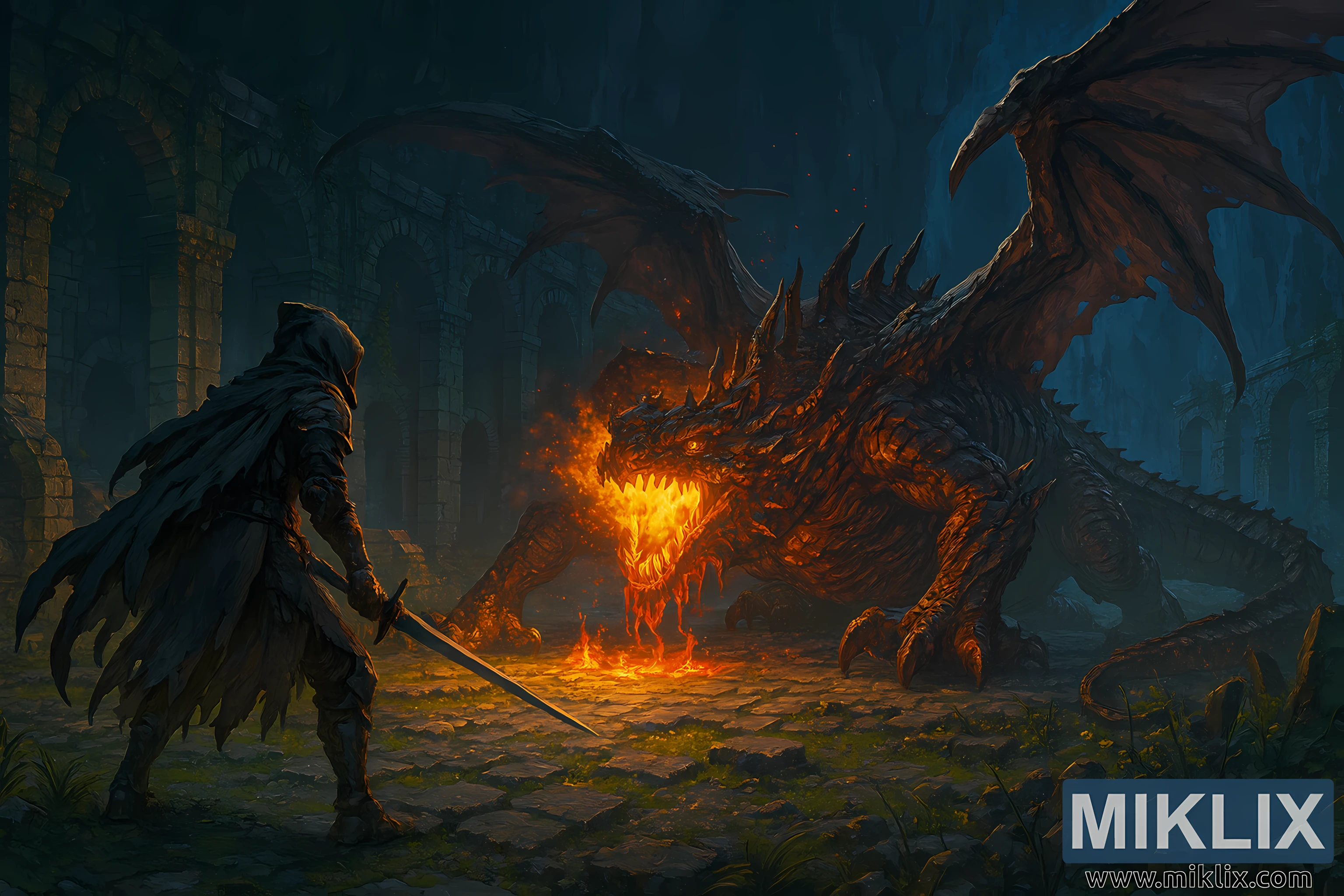 Muundo huo unasawazisha maumbo hayo mawili katika mgongano mkali, kila moja ikichukua upande mmoja wa picha. Usanifu wa pango—matao yanayobomoka, jiwe lenye moshi, na vivuli vya mbali—huunda mgongano, huku mwingiliano wa mwanga wa joto na baridi ukiboresha hali. Moto wa joka hutupa mwangaza na vivuli vinavyobadilika katika eneo lote, ukilinganisha na rangi ya bluu na kijani kibichi ya mandharinyuma. Maelezo madogo kama nyasi zilizotawanyika, mabamba ya mawe yaliyopasuka, na makaa hafifu ya kichawi huongeza kina na umbile.