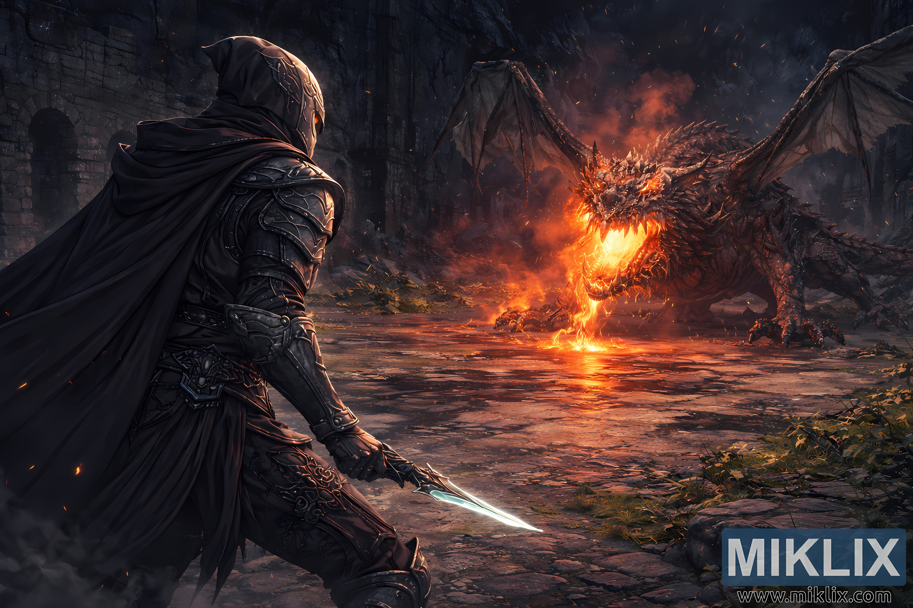 Mazingira ya pango lililoharibiwa yanaunda mzozo wao. Kuta za mawe zinazobomoka na matao yaliyoanguka yanaashiria ngome ya kale iliyodaiwa kwa muda mrefu na magma na kuoza. Moss na mizabibu inayotambaa hushikilia uashi, ikipambana kuishi katikati ya majivu, moshi, na joto. Mabwawa ya maji yasiyo na kina yanatawanyika ardhini, yakionyesha mwangaza wa moto wa wyrm na silaha nyeusi ya Tarnished, na kutengeneza kioo cha chuma baridi na magma inayowaka. Cheche ndogo hupeperushwa hewani polepole, zikipanda na kuwa miale hafifu ya mwanga inayotoboa dari ya pango kutoka kwenye nyufa zisizoonekana hapo juu.
