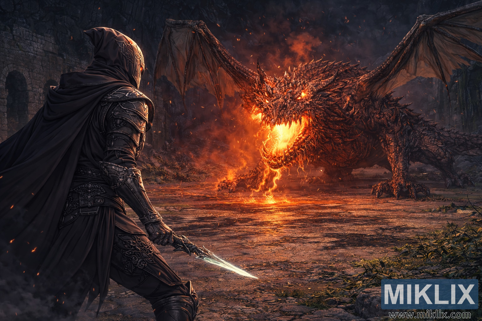 Mabawa ya ndege aina ya wyrm yameinuliwa juu na pana, yakienea karibu upana wote wa pango. Utando wao uliopasuka na mifupa yameumbwa kama matao ya kanisa kuu lililoungua, na kugeuza kuta za mawe zilizoharibiwa nyuma yake kuwa mandhari isiyo na maana. Majivu na cheche zinazong'aa huzunguka angani, zikikamatwa na miale hafifu ya mwanga ikishuka kutoka kwenye nyufa zisizoonekana hapo juu. Ardhi kati ya shujaa na mnyama ni laini ya maji, masizi, na magma, na kutengeneza uso unaoakisi umbo jeusi la ndege aina ya Wyrm na sehemu ya ndani yenye moto.