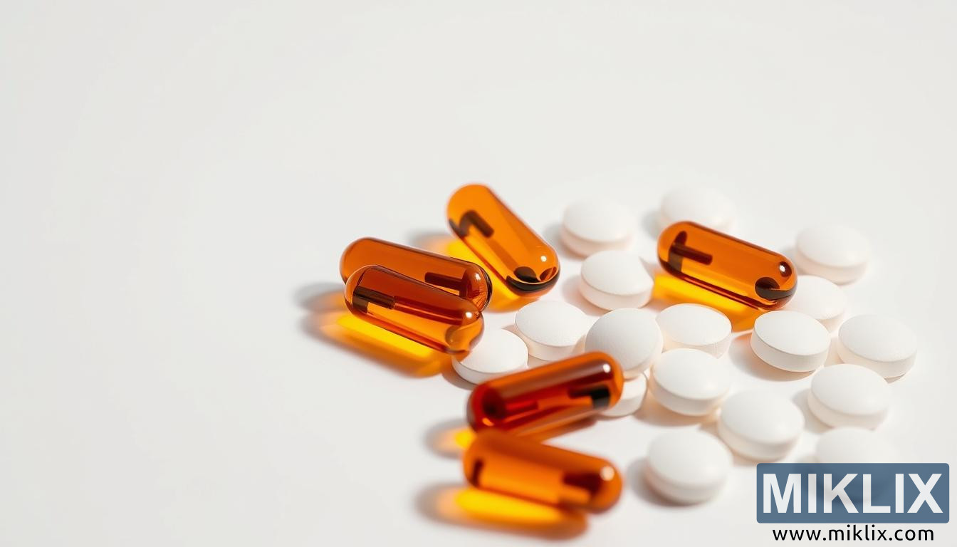 இந்தப் படம் குளுக்கோசமைன் சல்பேட் சப்ளிமெண்ட்களின் தெளிவான மற்றும் குறைந்தபட்ச சித்தரிப்பை வழங்குகிறது, அவை காப்ஸ்யூல் மற்றும் டேப்லெட் வடிவத்தில் ஒரு அழகிய, வெள்ளை பின்னணியில் வழங்கப்படுகின்றன. சுத்தமான, ஒழுங்கற்ற அமைப்பு தூய்மை மற்றும் மருத்துவ துல்லியத்தை வலியுறுத்துகிறது, கவனச்சிதறல் இல்லாமல் சப்ளிமெண்ட்ஸ் மீது கவனத்தை ஈர்க்கிறது. மேற்பரப்பு முழுவதும் சிதறிக்கிடக்கும் மென்மையான, வட்டமான வெள்ளை மாத்திரைகள், அவற்றின் மேட் பூச்சு மென்மையான ஒளியைப் பிடிக்கும் மென்மையான முகடுகளுடன் நுட்பமாக அமைப்புடன் உள்ளன. இந்த மாத்திரைகள், ஒரு கரிம, சற்று ஒழுங்கற்ற வடிவத்தில் அமைக்கப்பட்டிருக்கின்றன, அவை அன்றாட பயன்பாட்டிற்காக கவனமாக தயாரிக்கப்பட்டவை போல, இயற்கையான எளிமை மற்றும் அணுகல் உணர்வைத் தூண்டுகின்றன. இதற்கு நேர்மாறாக, பல அம்பர் நிற காப்ஸ்யூல்கள் அவற்றுக்குள் உள்ளன, அவற்றின் பளபளப்பான, ஒளிஊடுருவக்கூடிய ஓடுகள் ஒளி கடந்து செல்லும்போது சூடான துடிப்புடன் ஒளிரும். காப்ஸ்யூல்களின் மெருகூட்டப்பட்ட மேற்பரப்புகள் மென்மையான பிரதிபலிப்புகளை உருவாக்குகின்றன, அதே நேரத்தில் அவற்றின் செழுமையான தங்க நிறம் அரவணைப்பு, உயிர்ச்சக்தி மற்றும் ஆற்றலைத் தூண்டுகிறது, வெள்ளை மாத்திரைகளின் மந்தமான எளிமைக்கு எதிராக ஒரு குறிப்பிடத்தக்க காட்சி வேறுபாட்டை வழங்குகிறது.