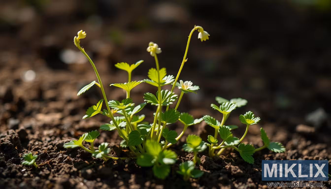 இருண்ட, ஊட்டமளிக்கும் மண்ணிலிருந்து அழகாக வெளிவரும் ஒரு இளம் பகோபா மோன்னீரி தாவரத்தின் மென்மையான மற்றும் நெருக்கமான காட்சியை இந்த புகைப்படம் படம்பிடிக்கிறது. அதன் மெல்லிய தண்டுகள் மென்மையாக மேல்நோக்கி உயர்ந்து, இயற்கையான வளைவில் வளைந்து, கிட்டத்தட்ட எடையற்றதாகத் தோன்றும் சிறிய வெள்ளை பூக்களால் முடிசூட்டப்பட்டு, அவற்றின் இதழ்கள் ஒளியின் மென்மையான தொடுதலைப் பிடிக்கின்றன. இலைகள் சிறியவை ஆனால் துடிப்பானவை, ஒவ்வொன்றும் விளிம்புகளில் நுட்பமான பற்களால் வடிவமைக்கப்பட்டுள்ளன, அவற்றின் பிரகாசமான பச்சை நிறங்கள் கீழே உள்ள பணக்கார, மண் டோன்களுக்கு ஒரு குறிப்பிடத்தக்க வேறுபாட்டைக் கொண்டுள்ளன. தாவரத்திற்கும் அதன் சுற்றுப்புறங்களுக்கும் இடையிலான தொடர்பு ஒரு இணக்கமான சமநிலையை உருவாக்குகிறது, அங்கு வாழ்க்கையும் பூமியும் அமைதியான மீள்தன்மையுடன் இணைந்திருக்கும். சட்டத்தின் குறுக்கே மெதுவாக வடிகட்டப்படும் இயற்கை ஒளி, தாவரத்தின் சிக்கலான கட்டமைப்புகளை எடுத்துக்காட்டுகிறது - அதன் நுண்ணிய தண்டுகள், அதன் இலைகளின் பளபளப்பான மேற்பரப்பு மற்றும் மெதுவாக மேலே அசையும் உடையக்கூடிய பூக்கள். நிழல்கள் மண்ணின் குறுக்கே லேசாக விழுகின்றன, தாவரத்தின் முப்பரிமாண இருப்பை மேம்படுத்துகின்றன, மேலும் அதற்கு ஆழம் மற்றும் உயிர்ச்சக்தியின் உணர்வைத் தருகின்றன.