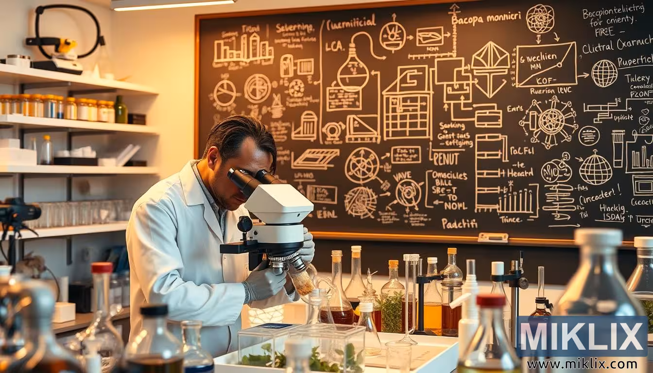 அறிவியல் கருவிகள் மற்றும் அதன் மருத்துவ குணங்கள் பற்றிய குறிப்புகளால் சூழப்பட்ட, நுண்ணோக்கியின் கீழ் பகோபா மோன்னீரியை ஆய்வு செய்யும் ஆய்வகக் காட்சி.