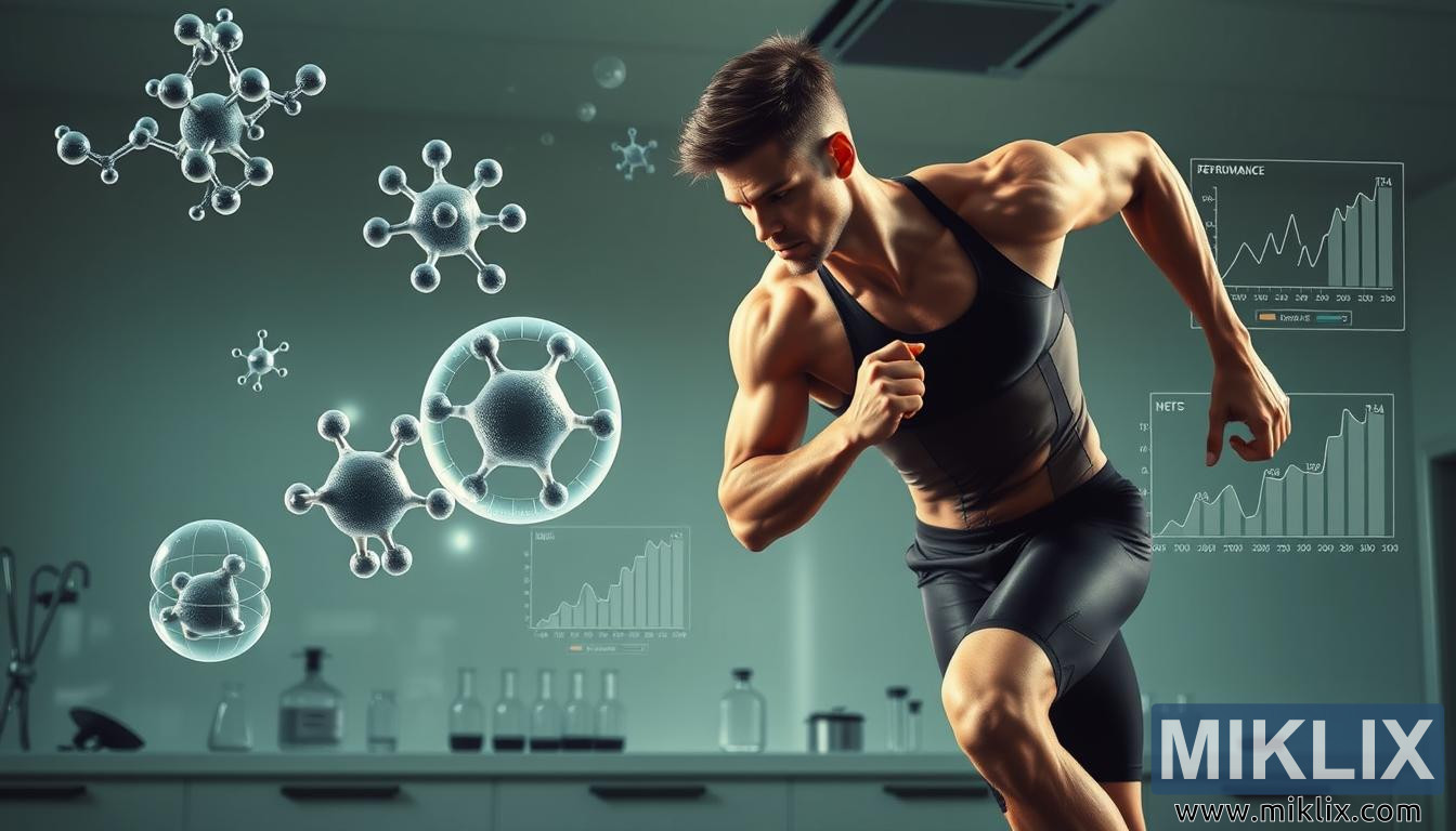 மூலக்கூறு கட்டமைப்புகள் மற்றும் வரைபடங்களைக் கொண்ட ஒரு விளையாட்டு வீரரின் விளக்கம், உடற்பயிற்சி செயல்திறன் மற்றும் அறிவியல் ஆராய்ச்சியை மேம்படுத்துவதில் சிட்ருலின் மாலேட்டின் பங்கைக் குறிக்கிறது.