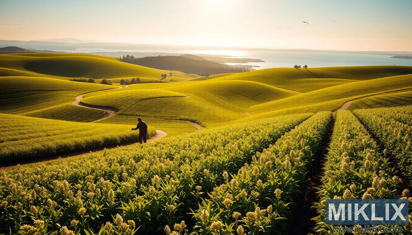 சியா விதை விவசாயத்தில் நிலைத்தன்மை மற்றும் நல்லிணக்கத்தைக் குறிக்கும், பயிர்களை மேய்க்கும் விவசாயிகள், வளைந்து செல்லும் பாதைகள் மற்றும் அமைதியான ஏரியுடன் கூடிய தங்க ஒளிரும் சியா வயல்கள்.